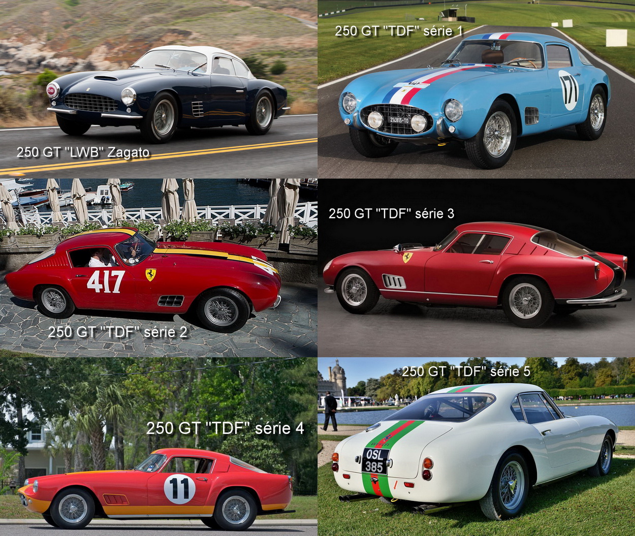 On peut classer les 250 GT "TdF" en cinq séries de carrosserie. 9 d'entres elles seront caractérisées par une grande vitre arrière, 9 autres surnommées "14 Louvres" arboreront 14 petites prises d'air sur la