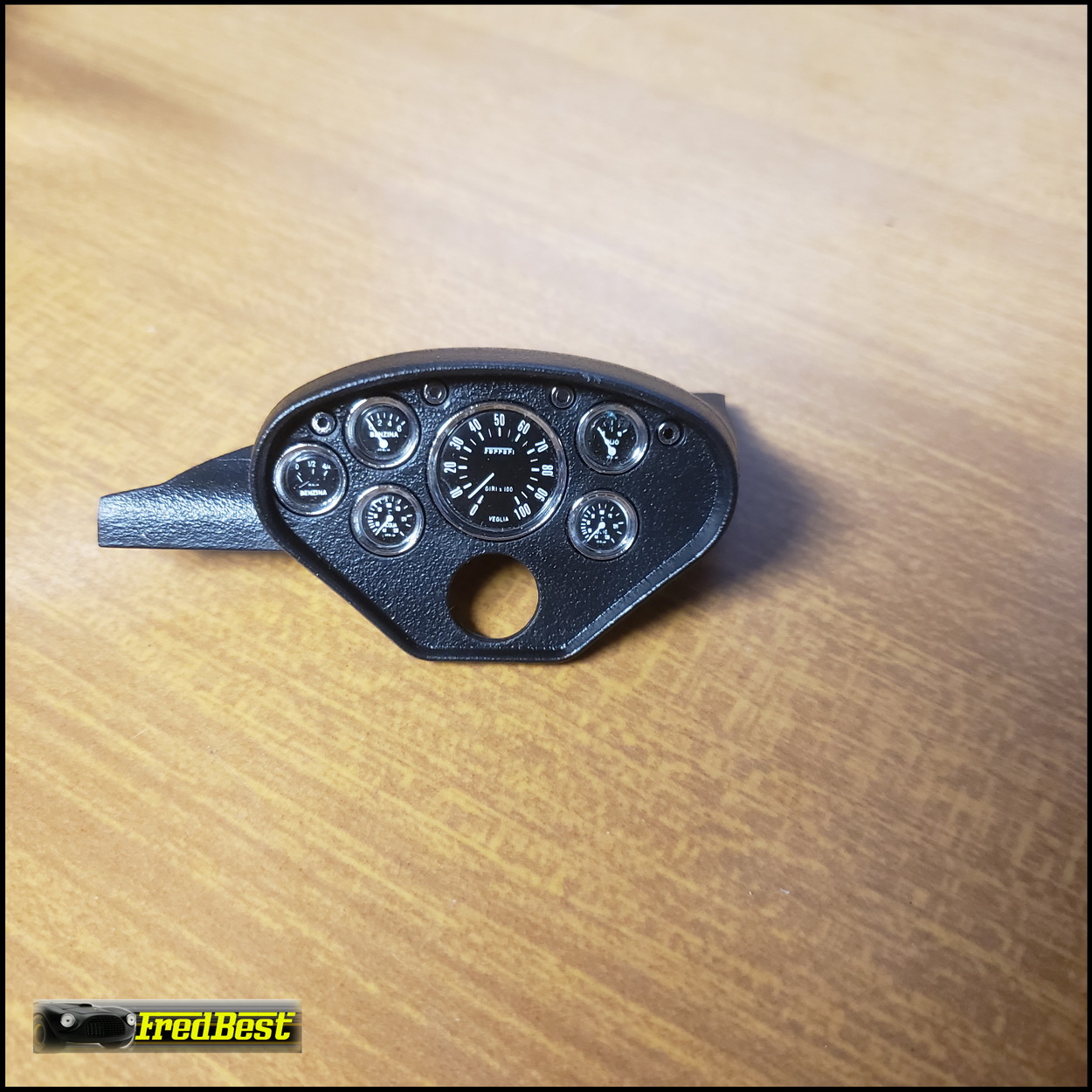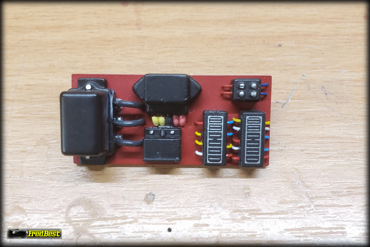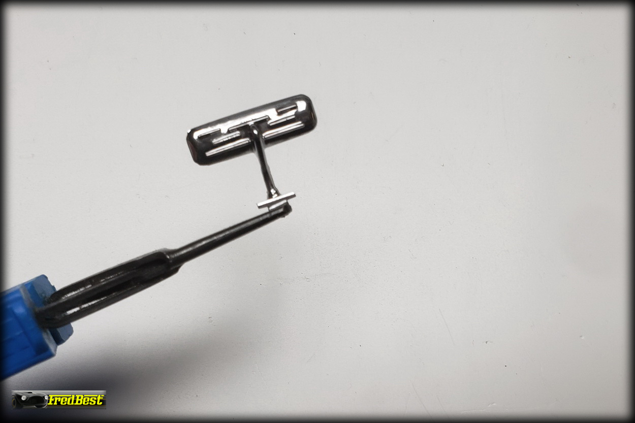 Création des entourages noirs de phares spécifiques à ce modèle et de la fixation de la plaque arrière particulière de l'époque. Il a fallu aussi recréer les écussons du N.A.R.T. des ailes avant, ceux fournis étaient bien