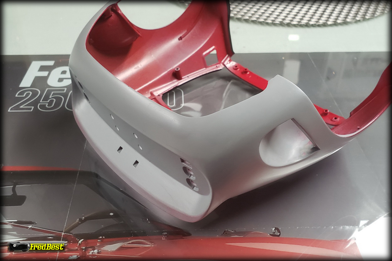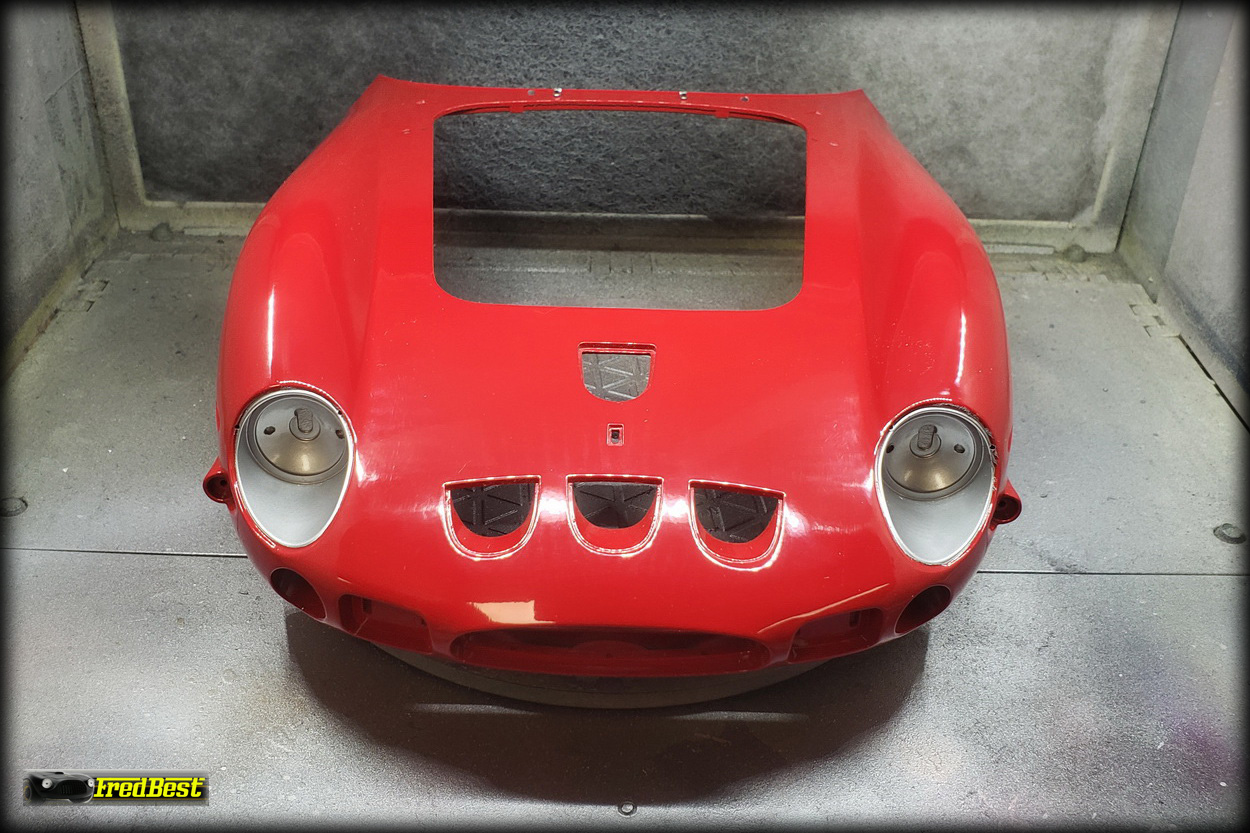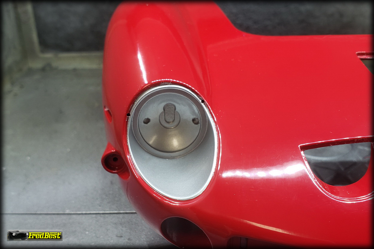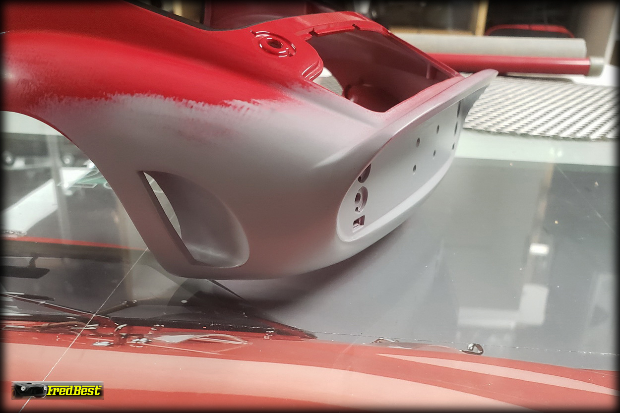 va falloir corriger ! Alors c'est parti: masquage en règle de la partie avant de la carrosserie et passage à la bombe d'aluminium. Enfin cette 250 GTO commence à ressembler à une 250 GTO avec le montage de ses phares.