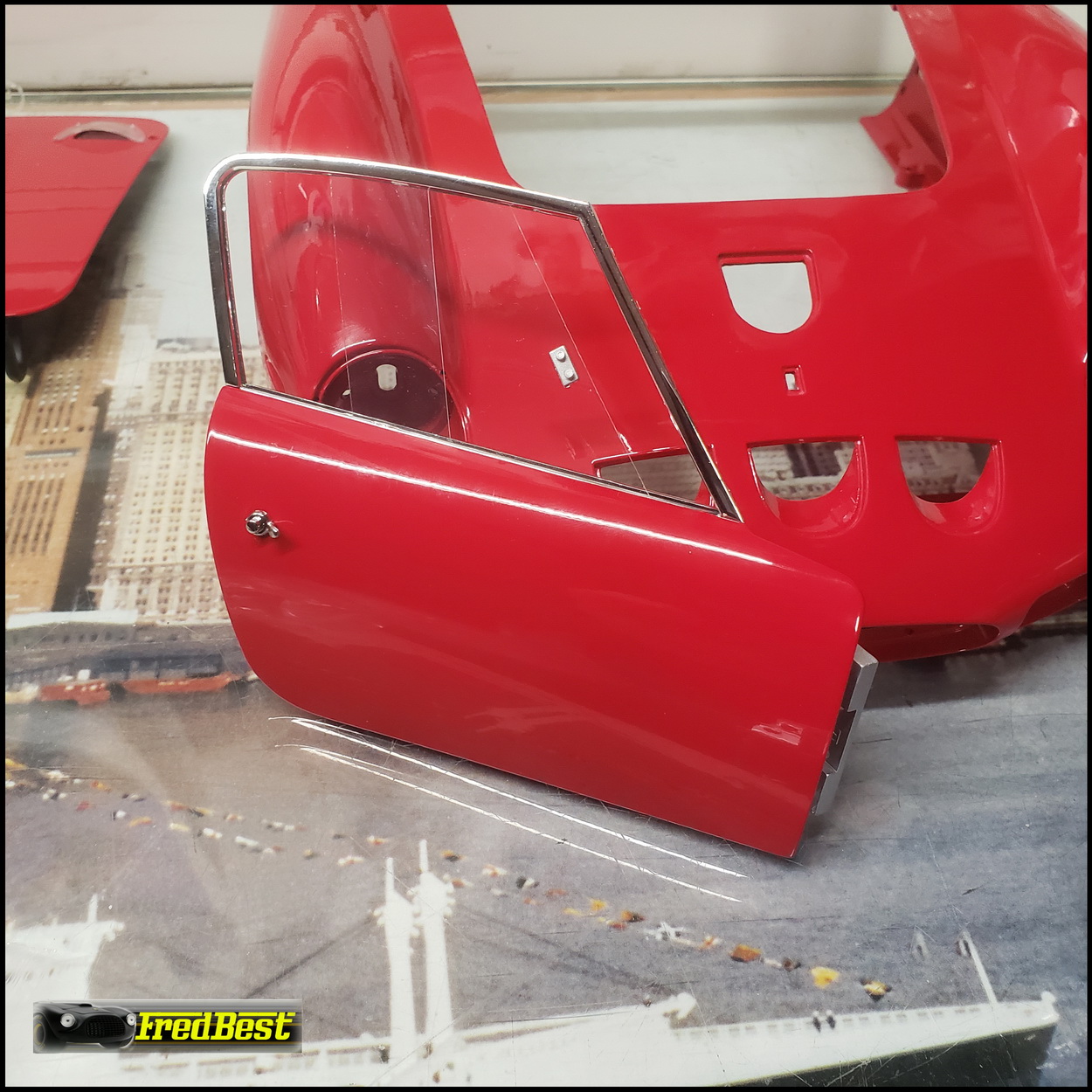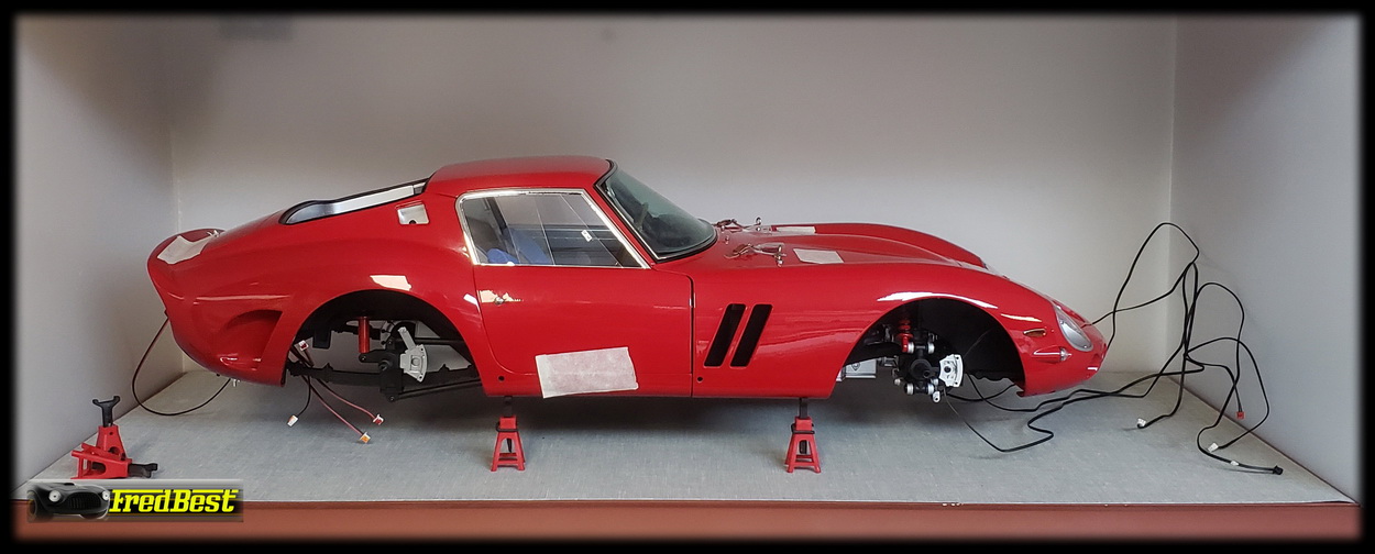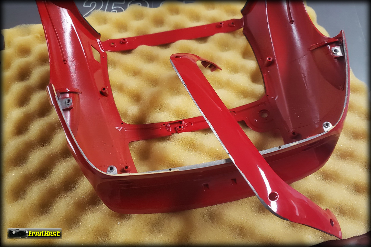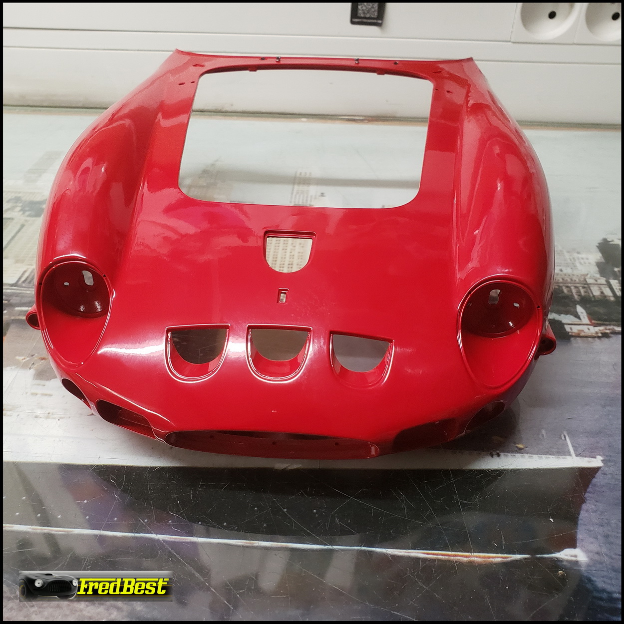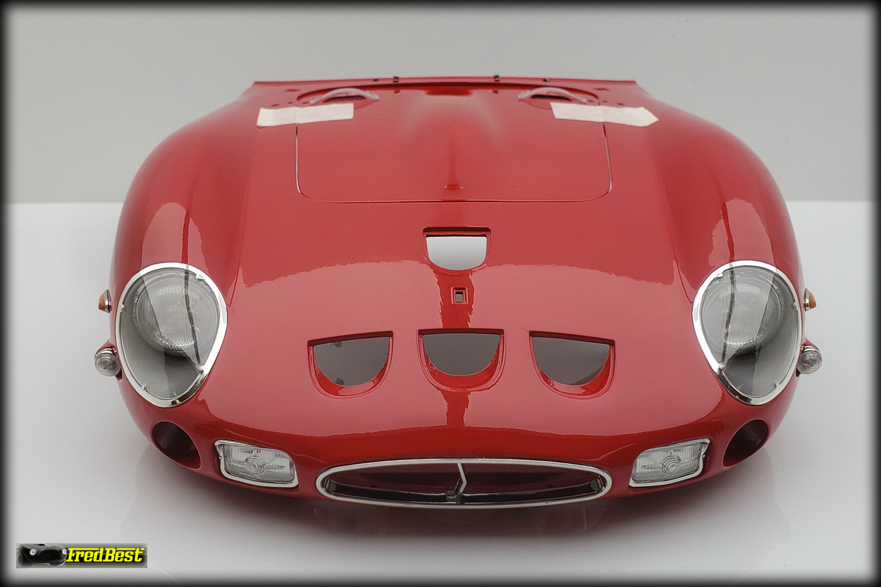 va falloir corriger ! Alors c'est parti: masquage en règle de la partie avant de la carrosserie et passage à la bombe d'aluminium. Enfin cette 250 GTO commence à ressembler à une 250 GTO avec le montage de ses phares.