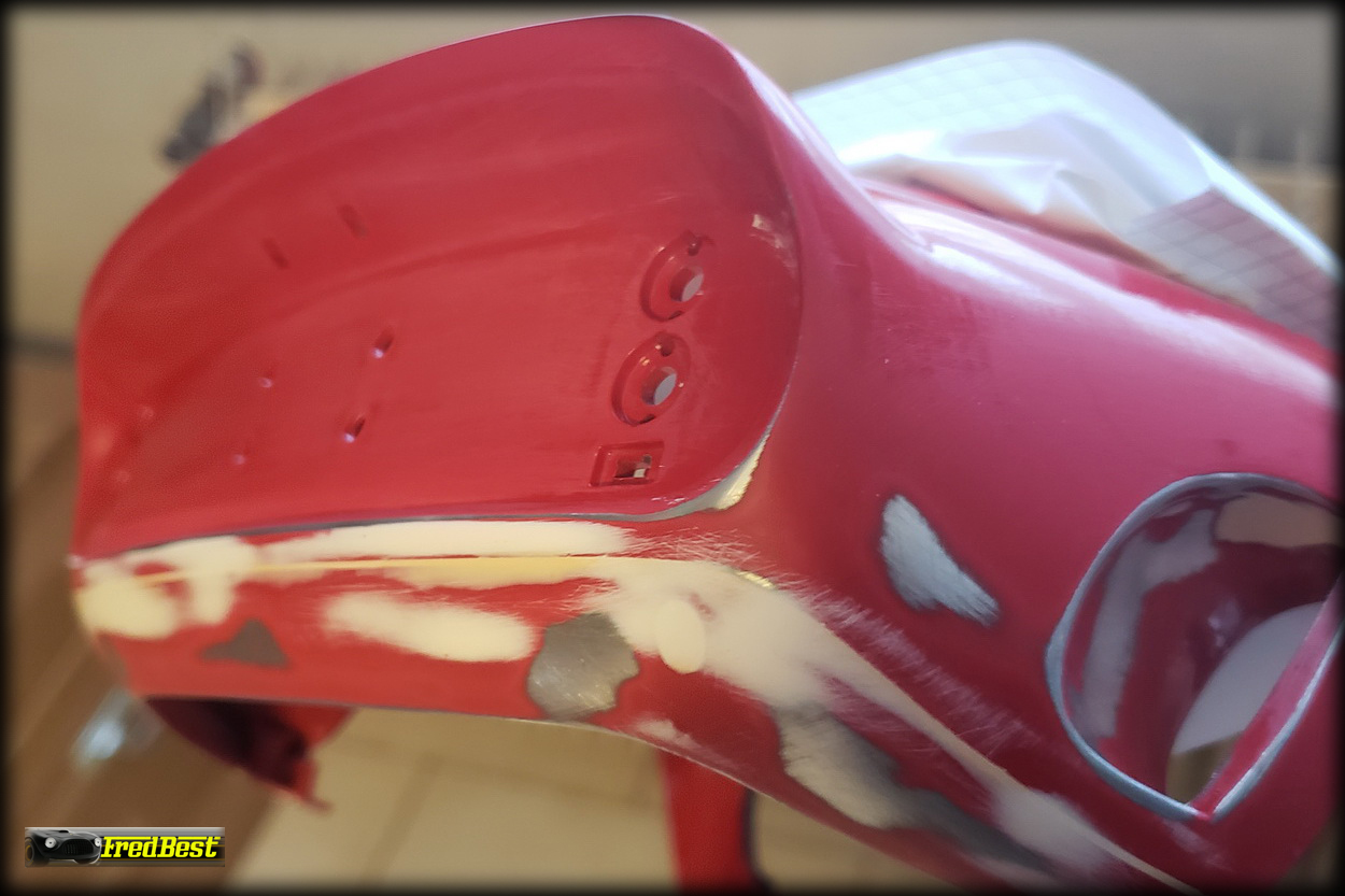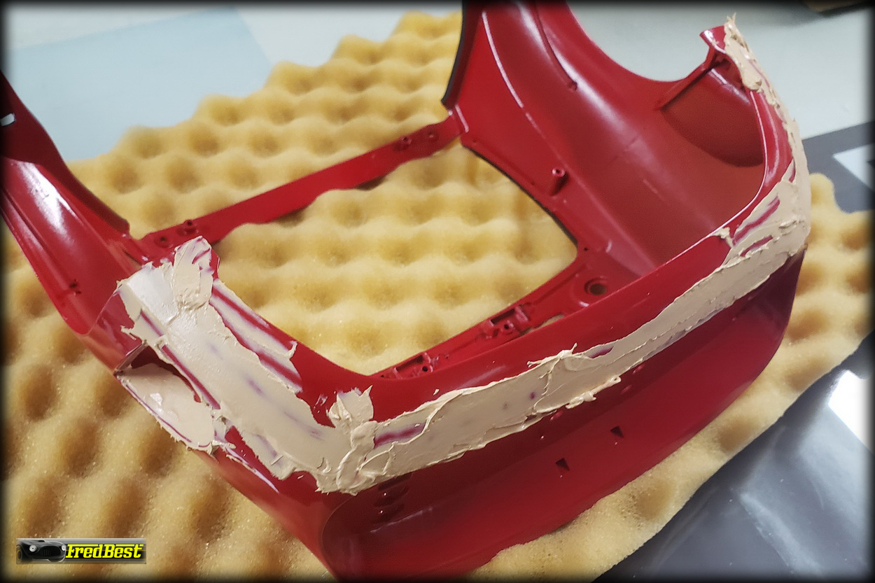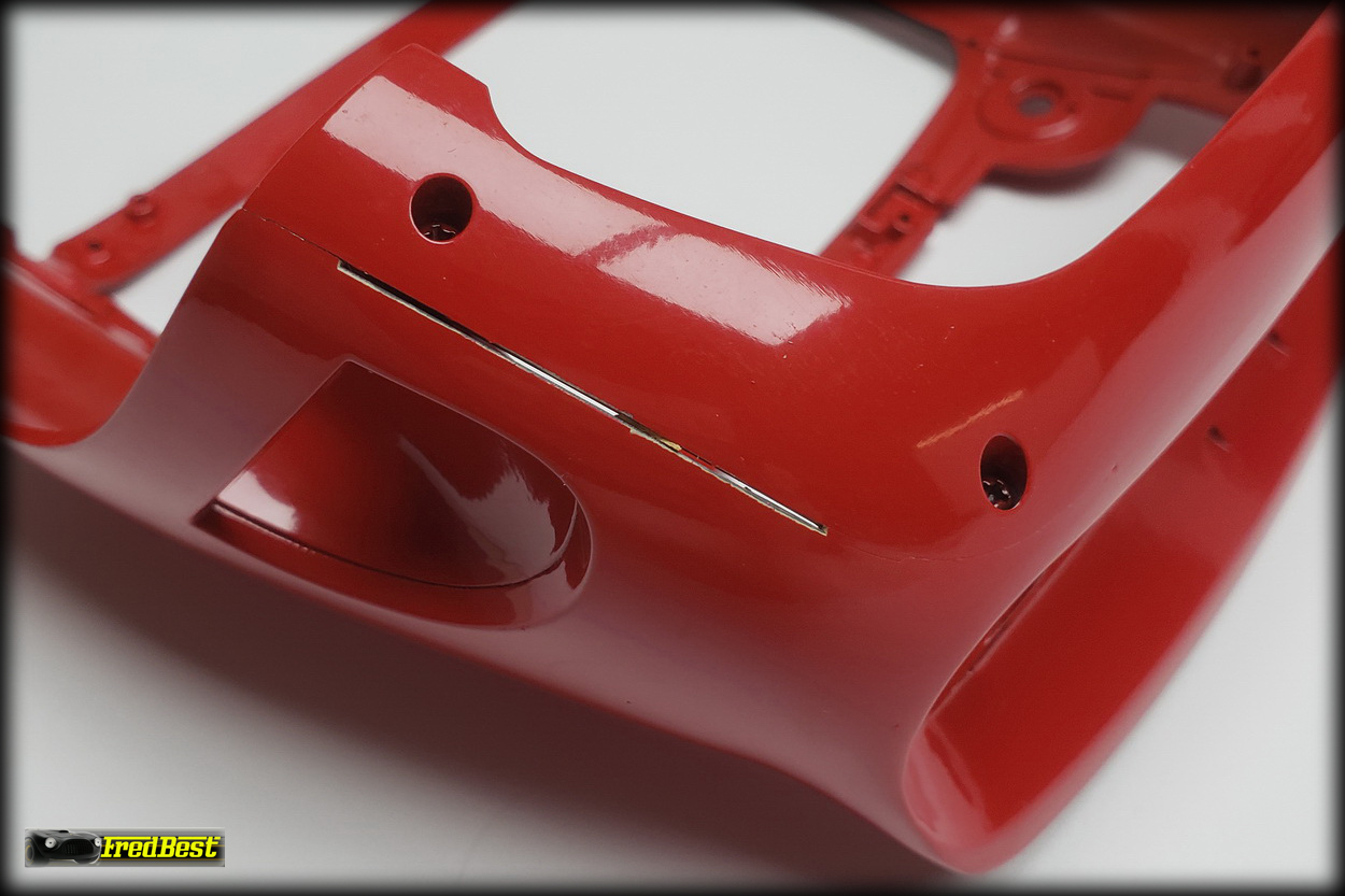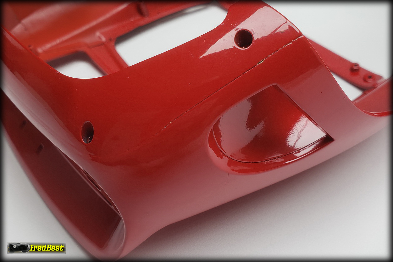 pièce endommagée que j'ai reçue, avec l'intention de la refaire correctement. En plus, j'ai prévu de boucher les puits de vis qui resteraient visibles une fois la voiture terminée et de gommer ce joint disgracieux