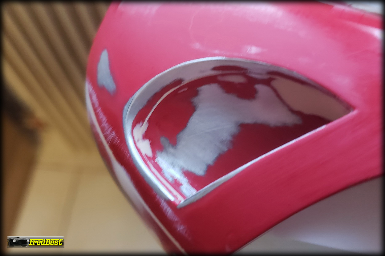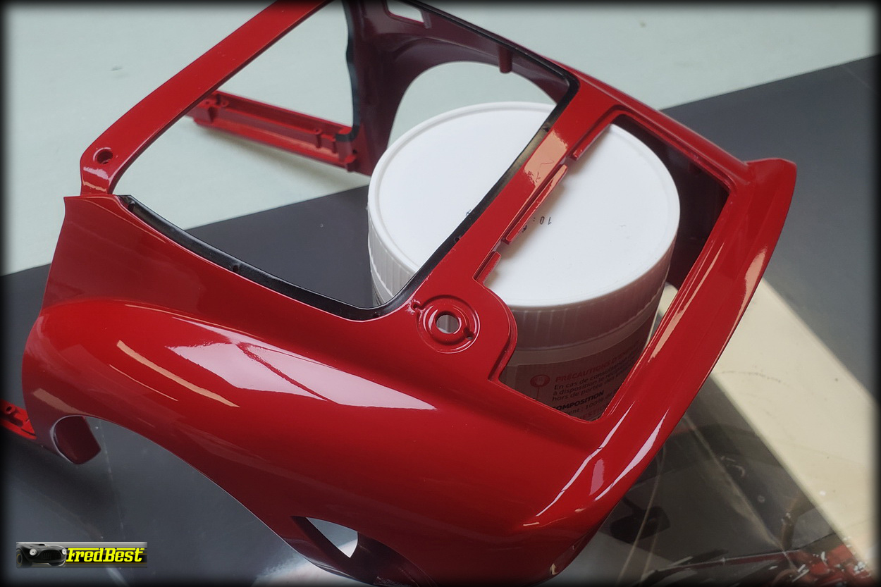 Donc démontage, nettoyage de l'ancien mastic, remasticage, peinture et polissage. Après une bonne journée de travail, la teinte est parfaite et je suis parvenu à ne faire apparaitre aucune démarcation qu'aurait pu