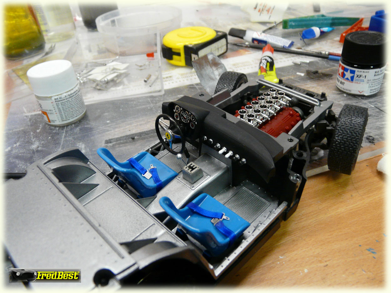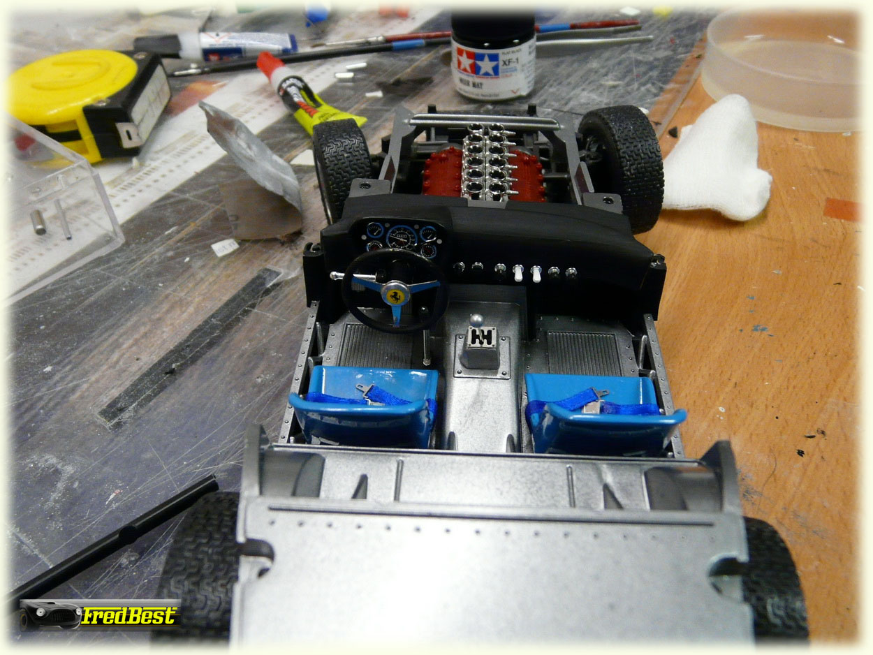 L'intérieur est aussi légèrement amélioré : pose de la fameuse grille de vitesse et montage de harnais sur les sièges repeints en bleu pour