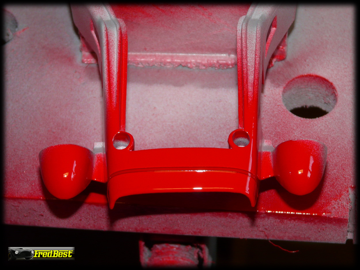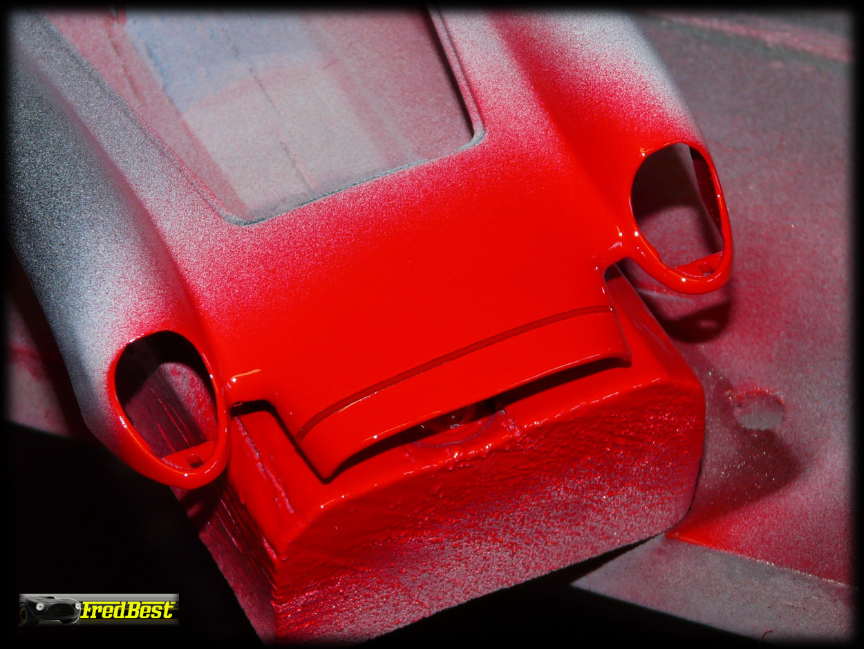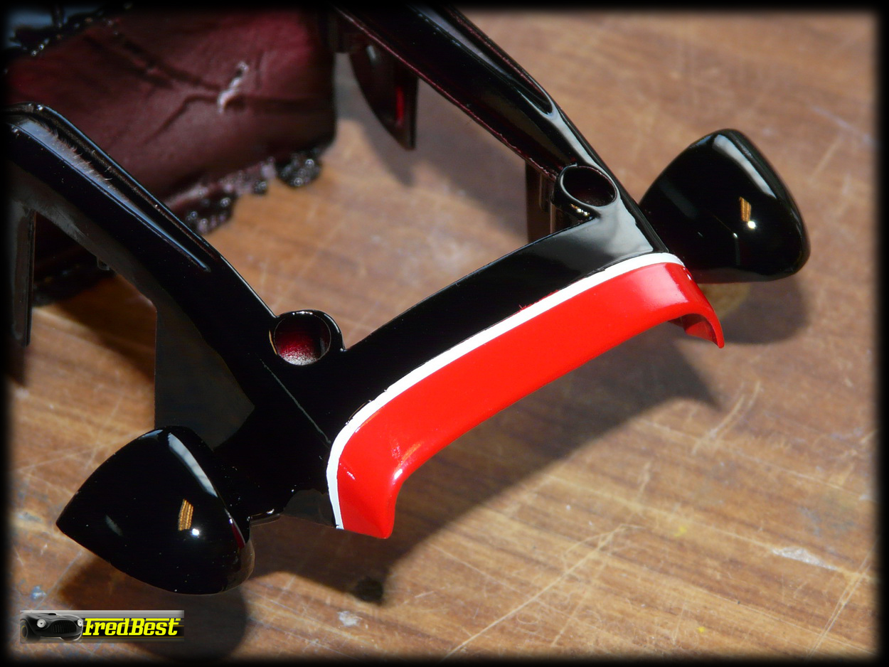Le nez de cette Testa Rossa a tout d'abord était peint en blanc. Masquage pour garder la bande blanche et passage du nez en rouge.