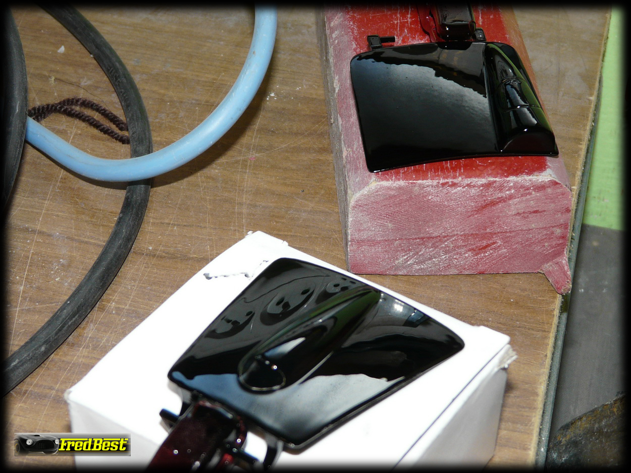 Une fois les masquages enlevés, on passe au vernis. 2 fines couches, pose des décalquos et 2 nouvelles fines couches de vernis