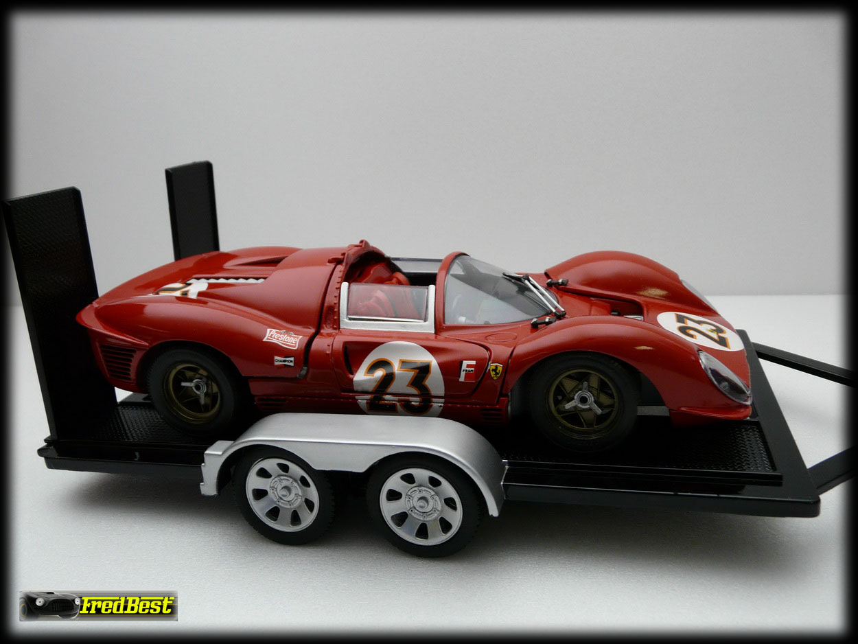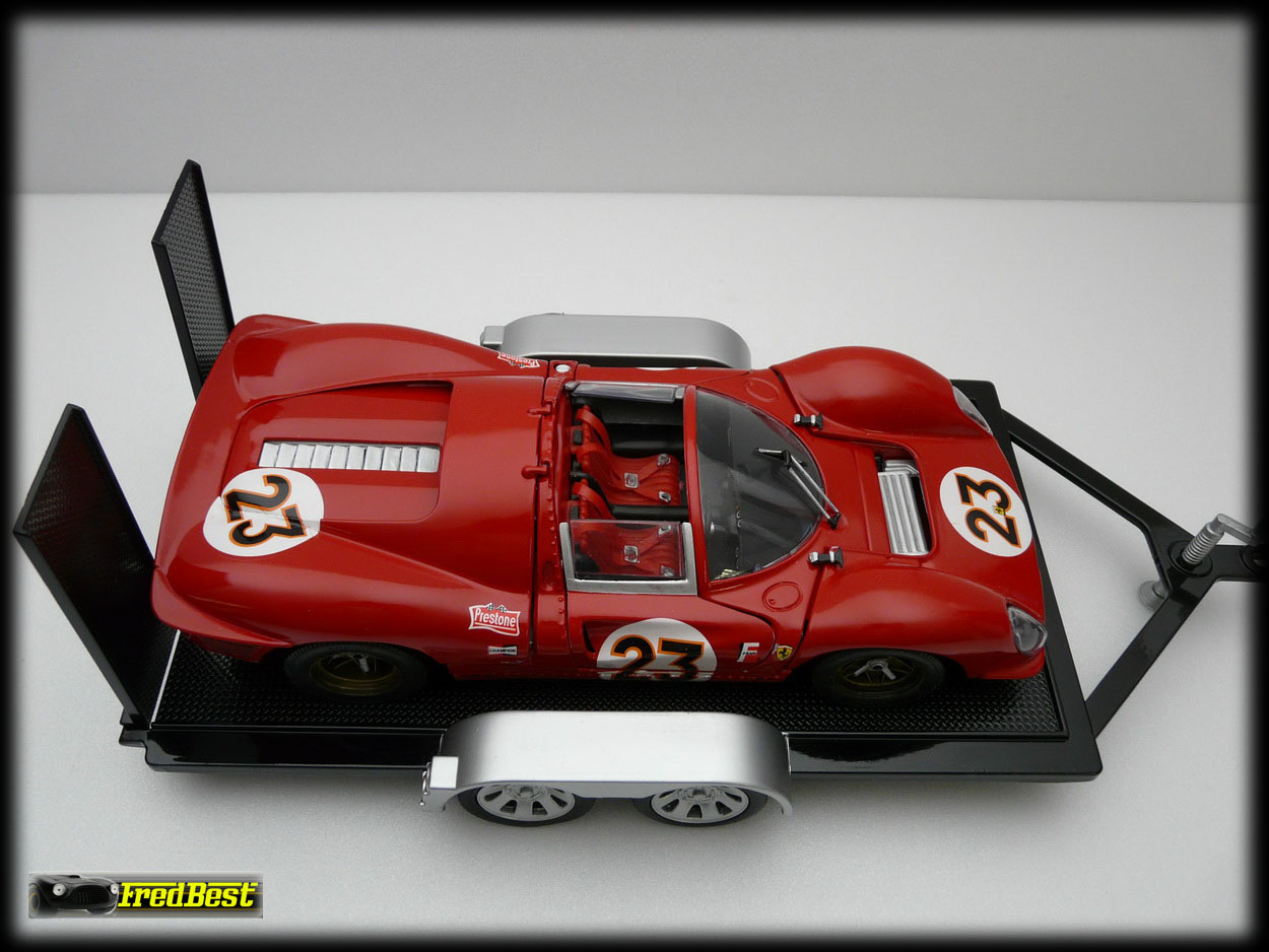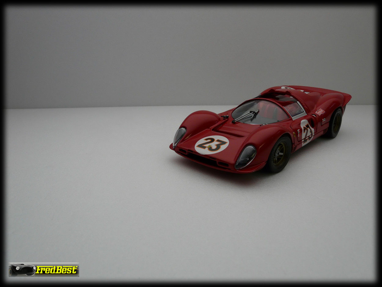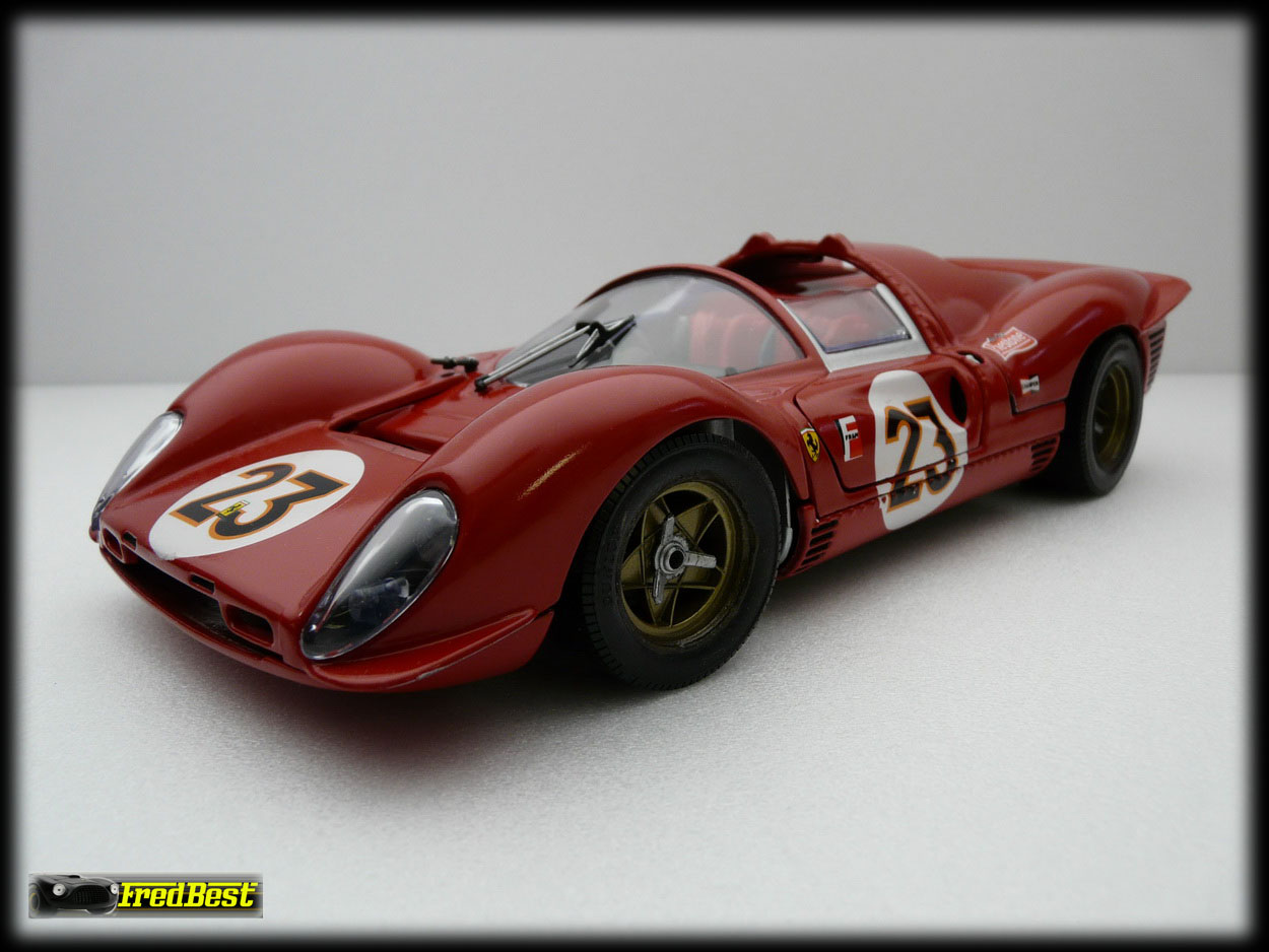 Voici donc la fameuse 330 P3/4, châssis 0846, victorieuse aux 24H de Daytona 67. Cette reproduction au 1/18 de chez Jouef a necessitée une bonne restauration avant de retrouver sa livrée 67.