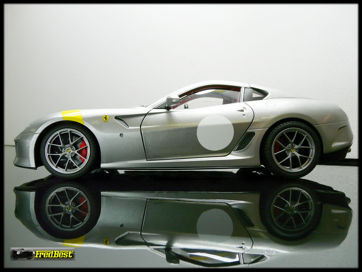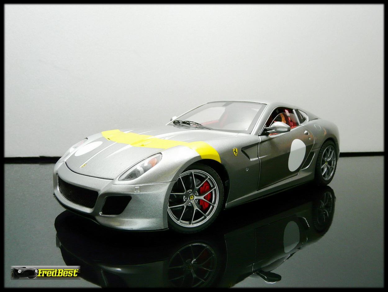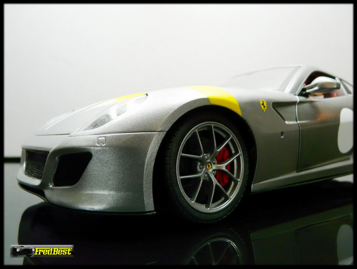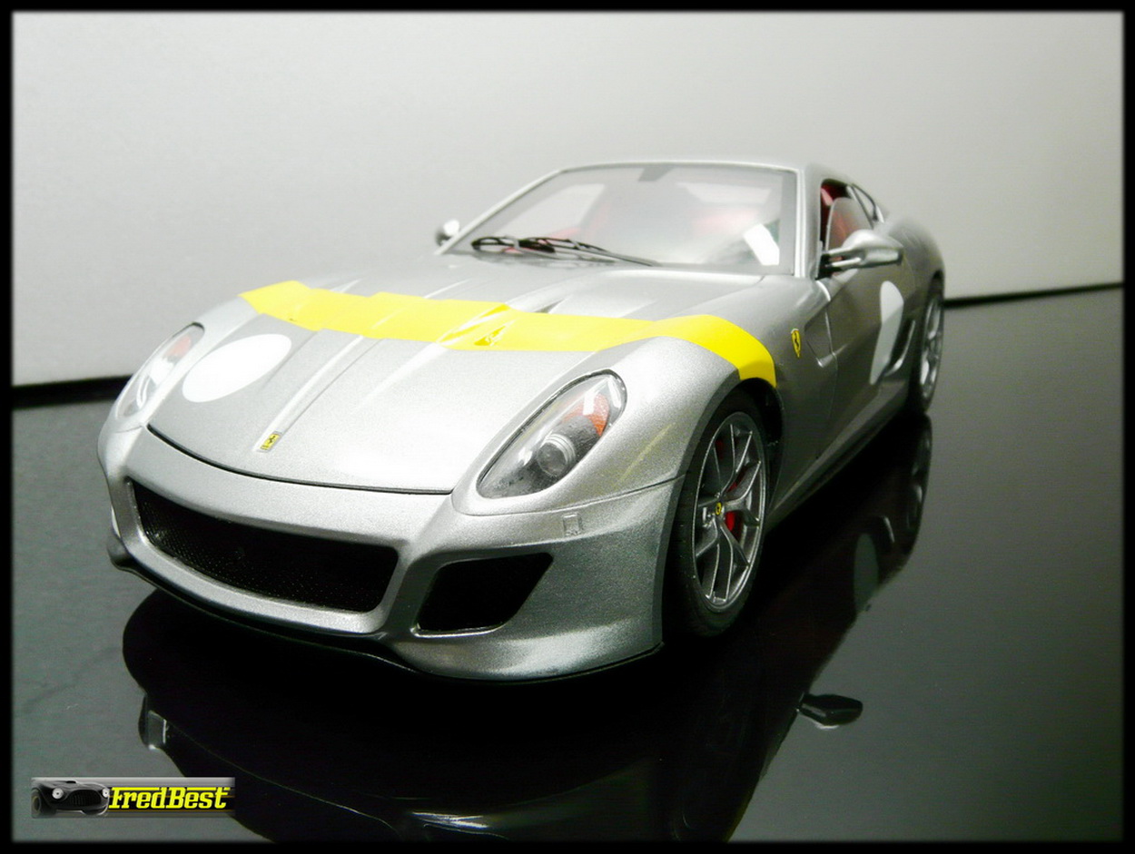 La miniature présentée ici est la version « Livrée Historique » disponible au catalogue d’options de la 599 GTO, reprenant les couleurs de la
