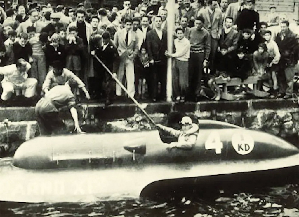 l'eau lorsque le bateau était lancé, réduisant considérablement sa friction avec la surface. Evoluant en catégorie 400 kg et propulsé par un moteur Alfa Roméo type 158, Castoldi établi avec