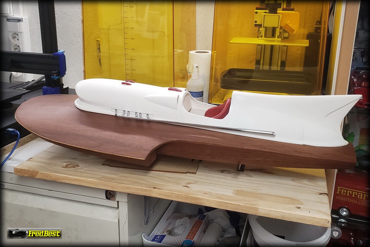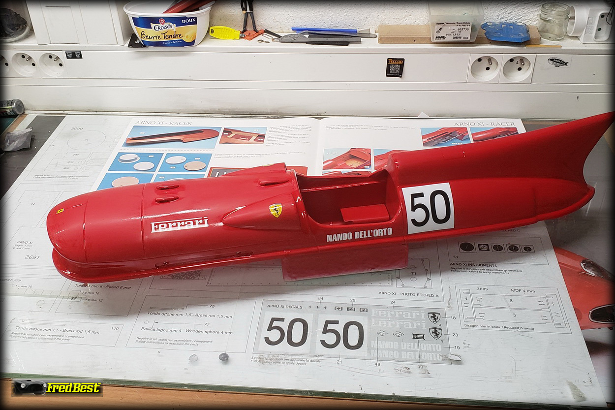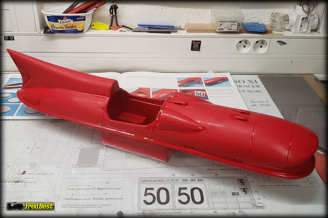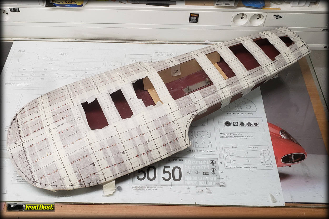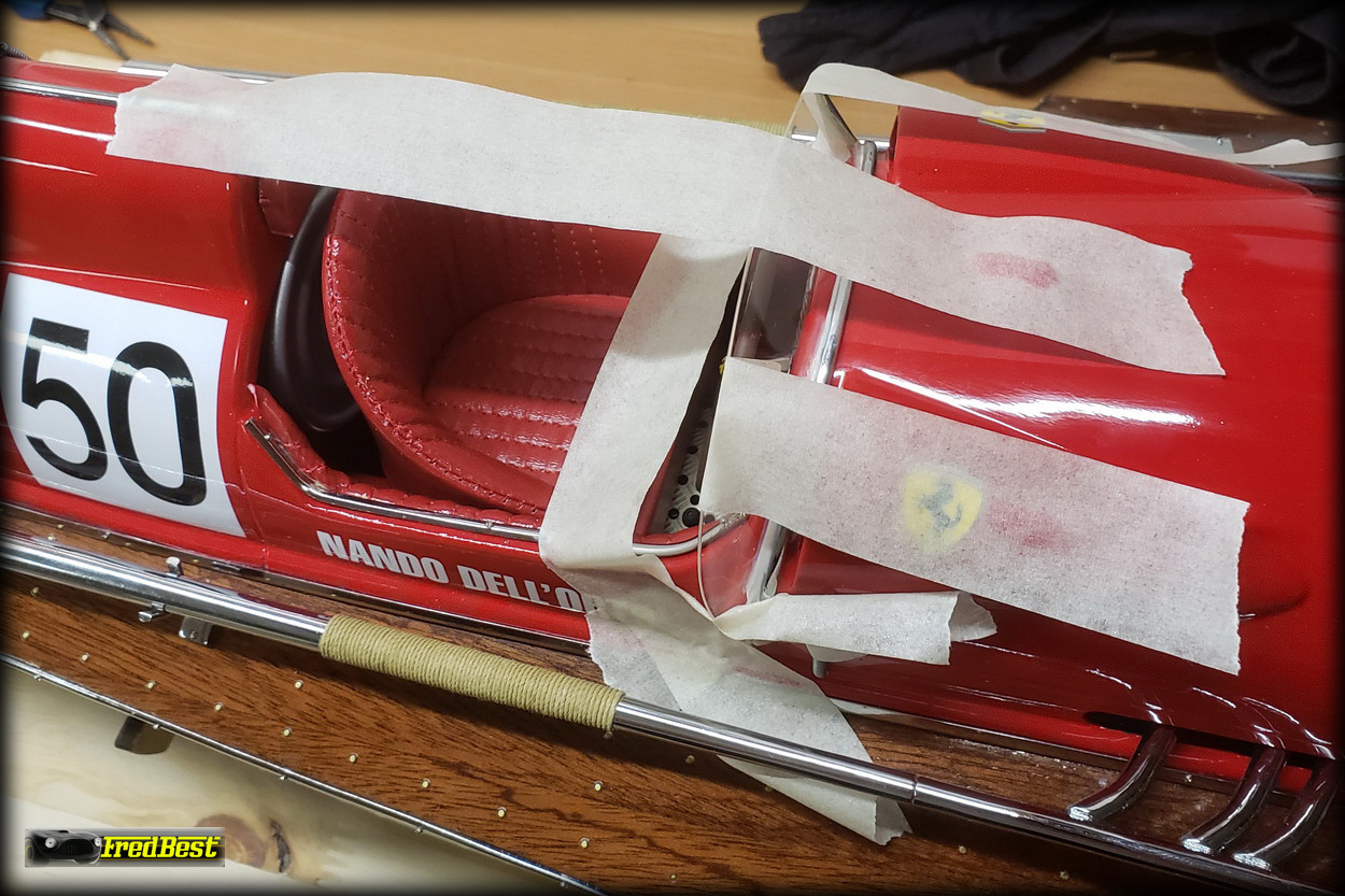 Ultime étape de la construction de cet Arno XI à l'échelle 1/8ème, la délicate pose du pare-brise, un croissant de lune devant épouser la courbure de la carrosserie en ne laissant