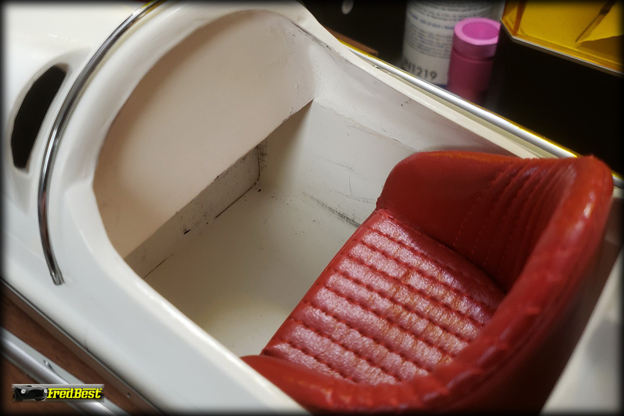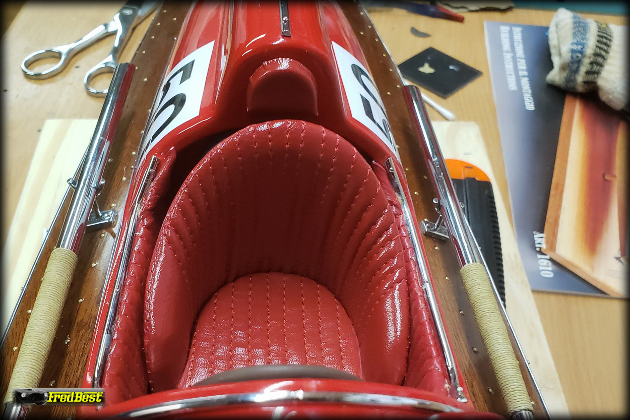 Encore une opération incertaine,coller les capitonnages en cuir sur les parois du cockpit en veillant à ce qu'ils épousent parfaitement les bords ! Fort heureusement, la colle Néoprène