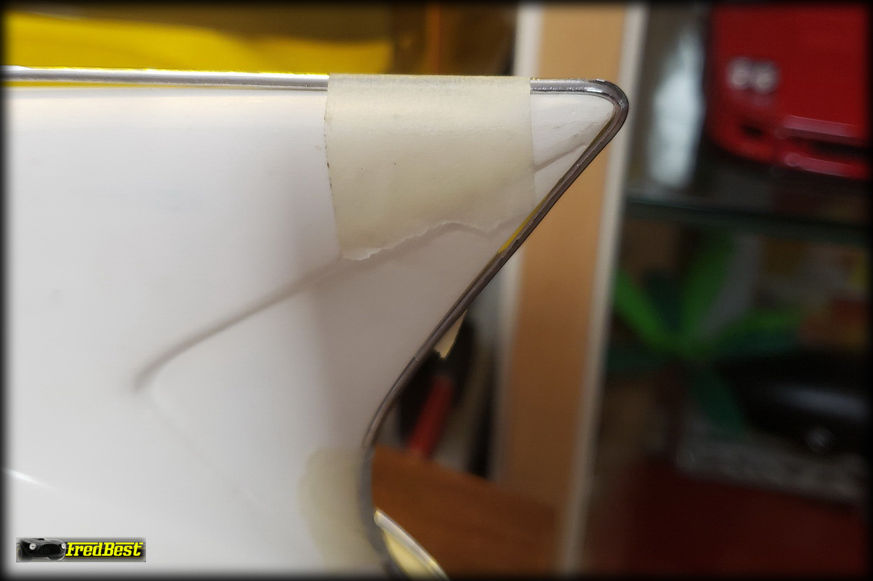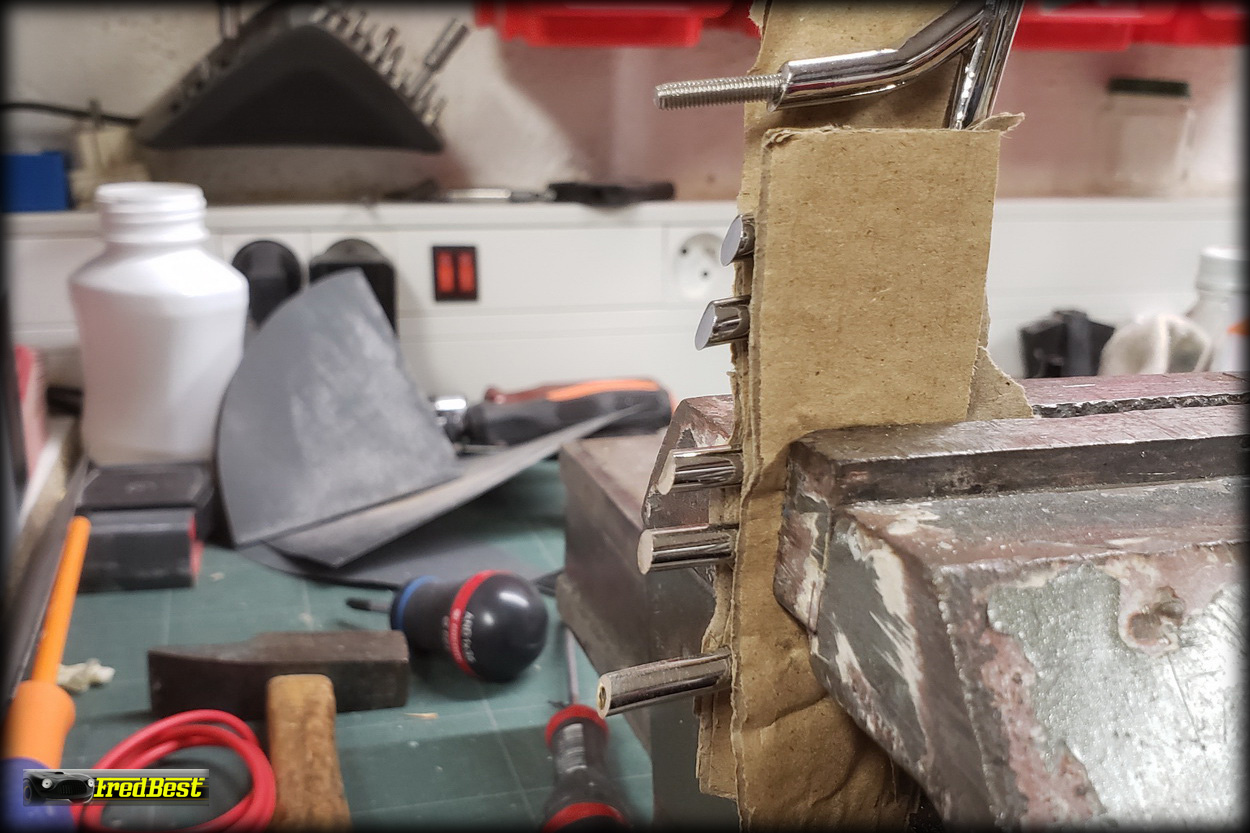La vis cassée sur le demi-cercle chromé avant a aussi été réparée. Je ne suis pourtant pas parvenu à retirer le corps de l'ancienne, le coin de la baguette a juste été fixé par-dessous