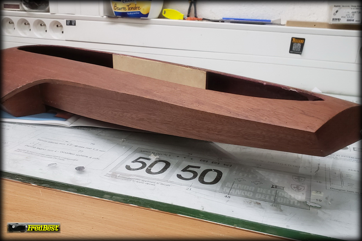 Il est maintenant temps de s'attaquer au dessous de la coque avec la pose des renforts latéraux, du gouvernail et de l'arbre d'hélice. Pas de soucis particuliers si ce n'est ces satanées