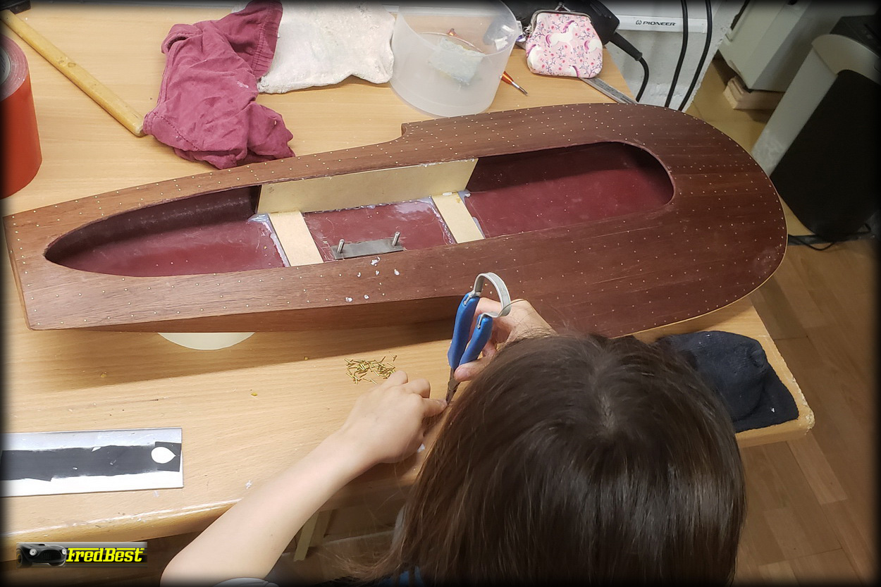 Ma petite assistante est arrivée au bout de tous ses clous, elle les a même comptés: il y en a 655 au total, 475 sur le dessus, 81 par côté et 18 sur la poupe. Pas mal pour dix petits doigts,