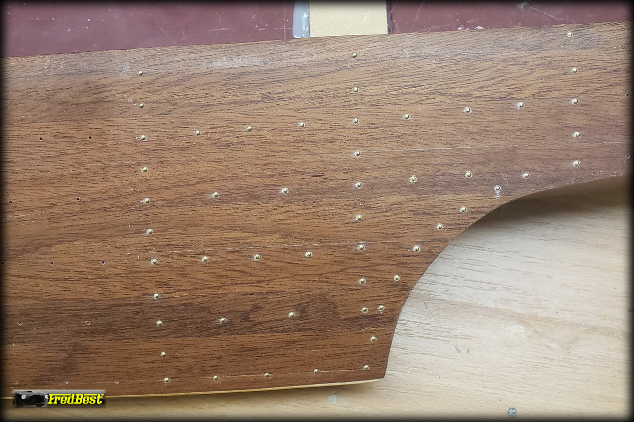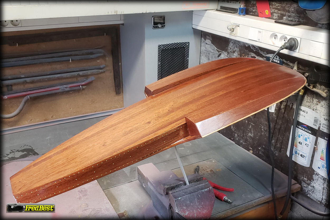 Par contre, le choix de vernir la coque après la pose de ces clous n'était peut être pas la meilleure des solutions. Certes, je m'étais préparé à ne pas re-poncer entre les couches mais je n'avais pas