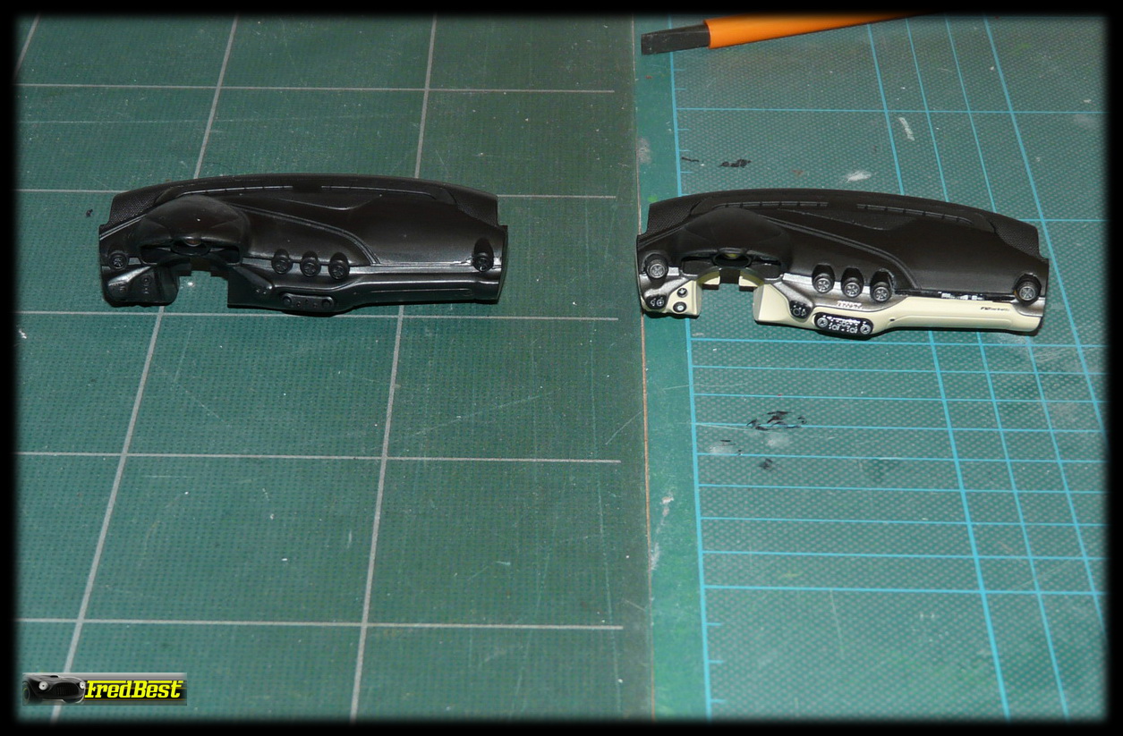 riveté sur l'arrière, les pattes de charnière et le support plastique sont là. Petit coup de Dremel, vérification avec ce qui reste de l'"Elite"
