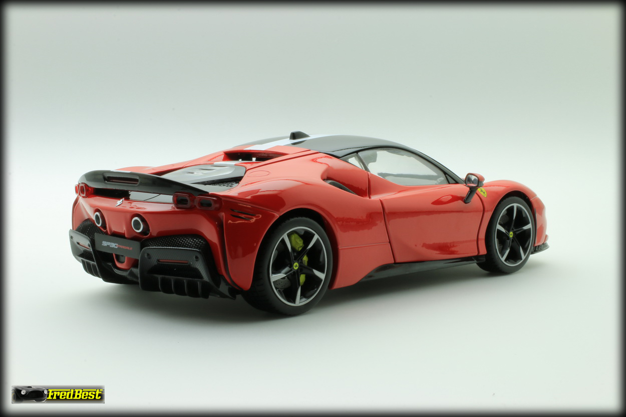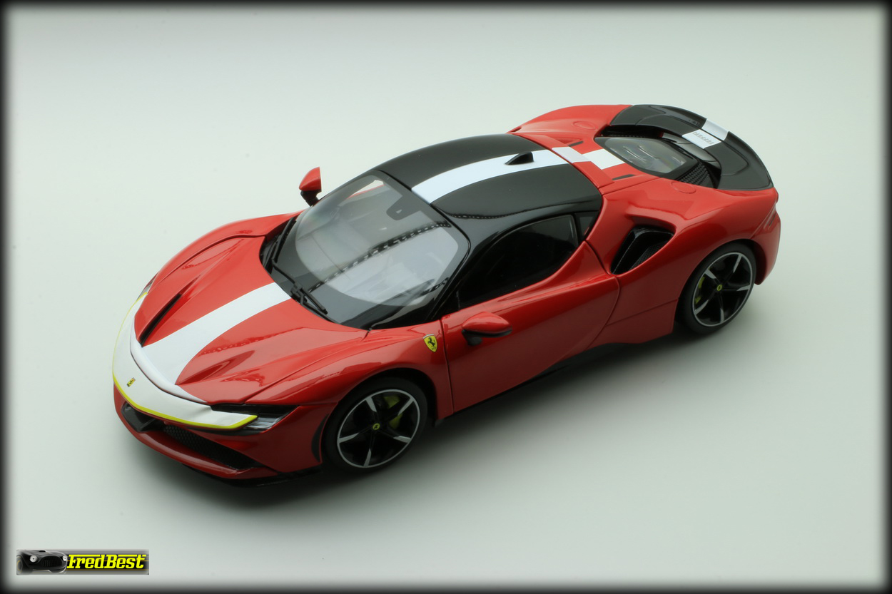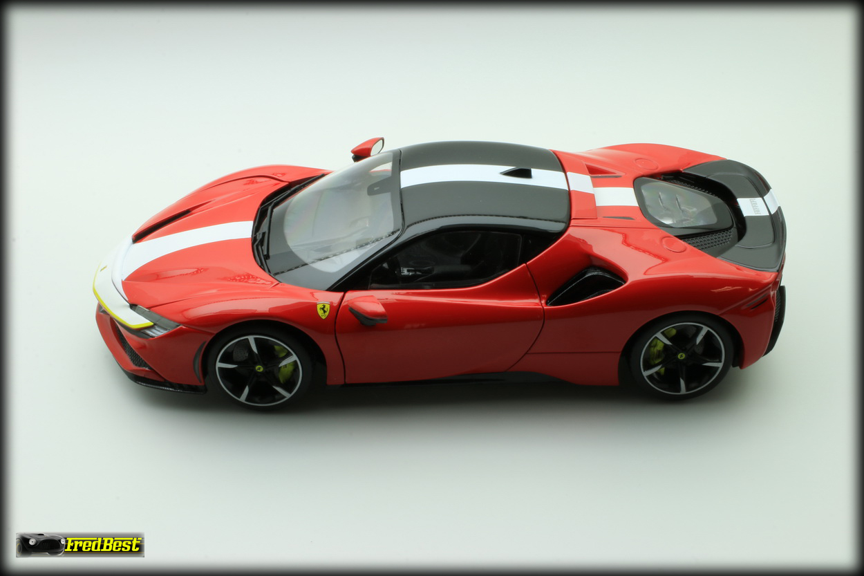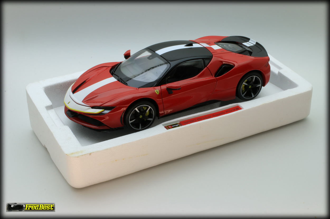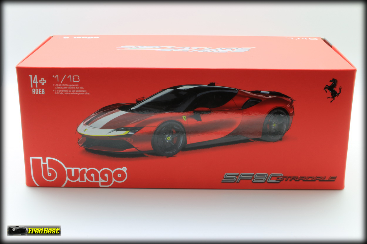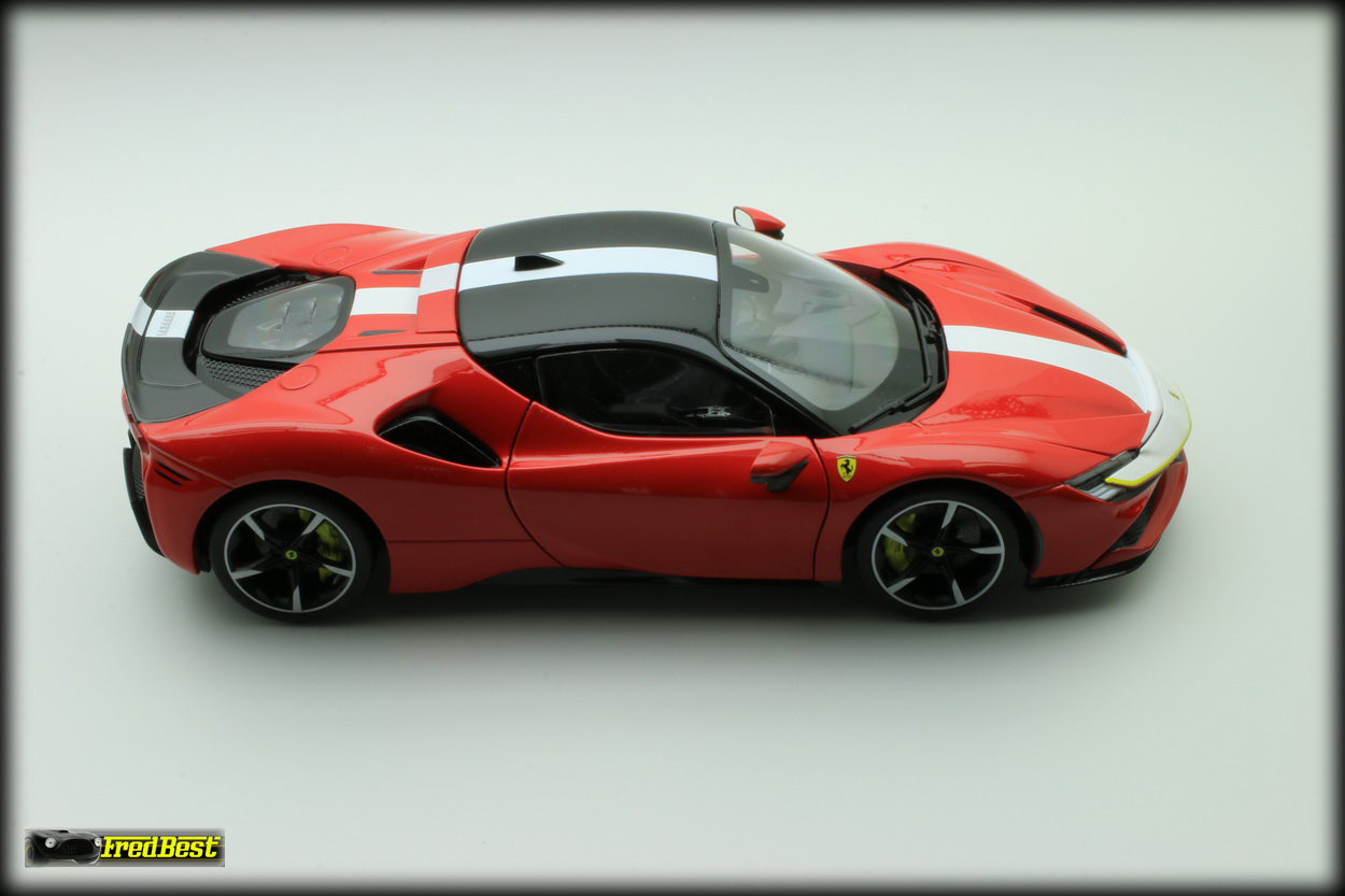 Vous allez pouvoir retrouver sur cette page une SF90 avec son pack Assetto Fiorano, reproduite au 1/18 par Bburago en finition "Signature", le haut gamme de la marque.