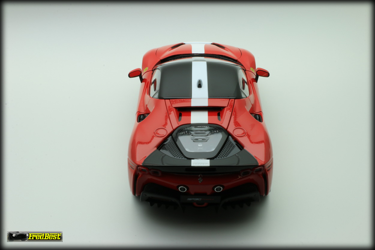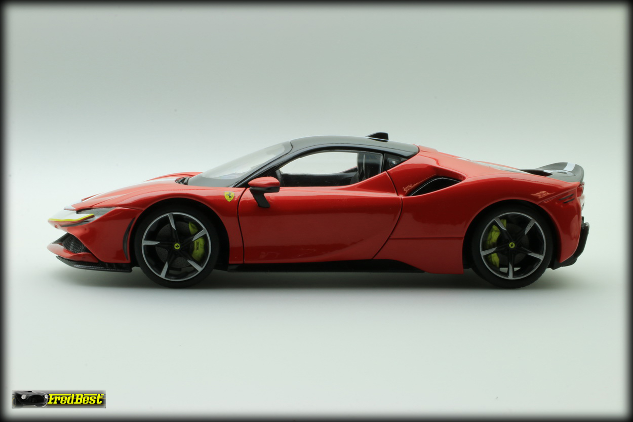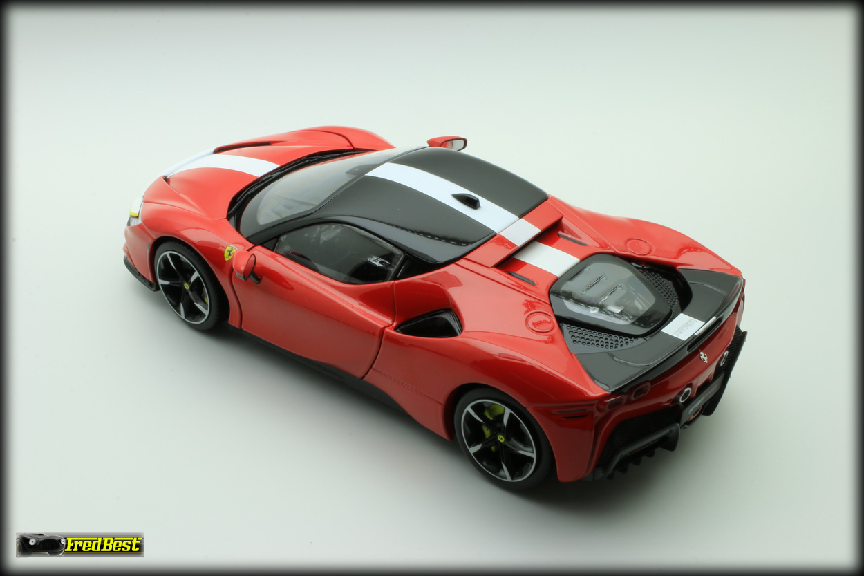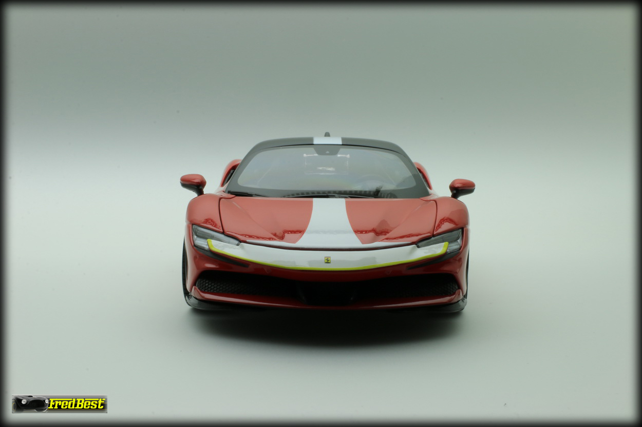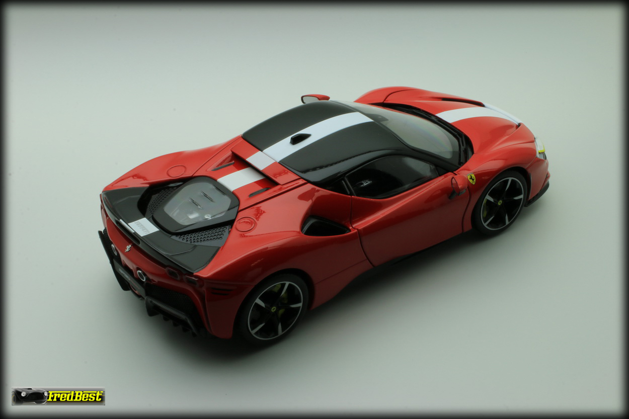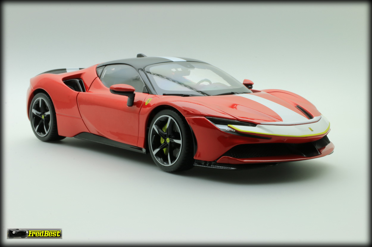 Vous allez pouvoir retrouver sur cette page une SF90 avec son pack Assetto Fiorano, reproduite au 1/18 par Bburago en finition "Signature", le haut gamme de la marque.