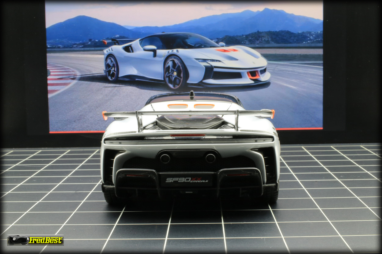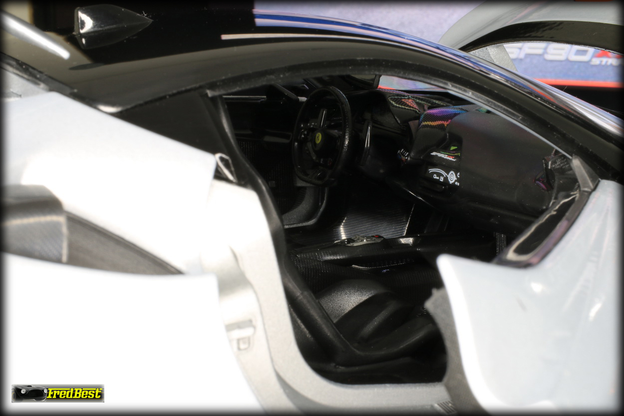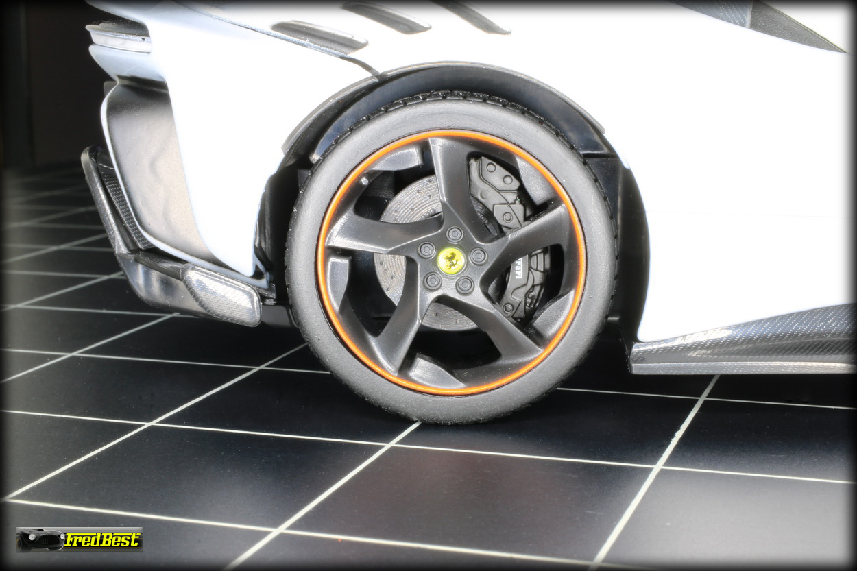 la SF90 XX sans être exceptionnel est toujours assez convaincant, les ajustement des ouvrants, porte, coffre avant et arrière, sont relativement bons et les jantes noires avec leur cerclage rouge sont du plus bel