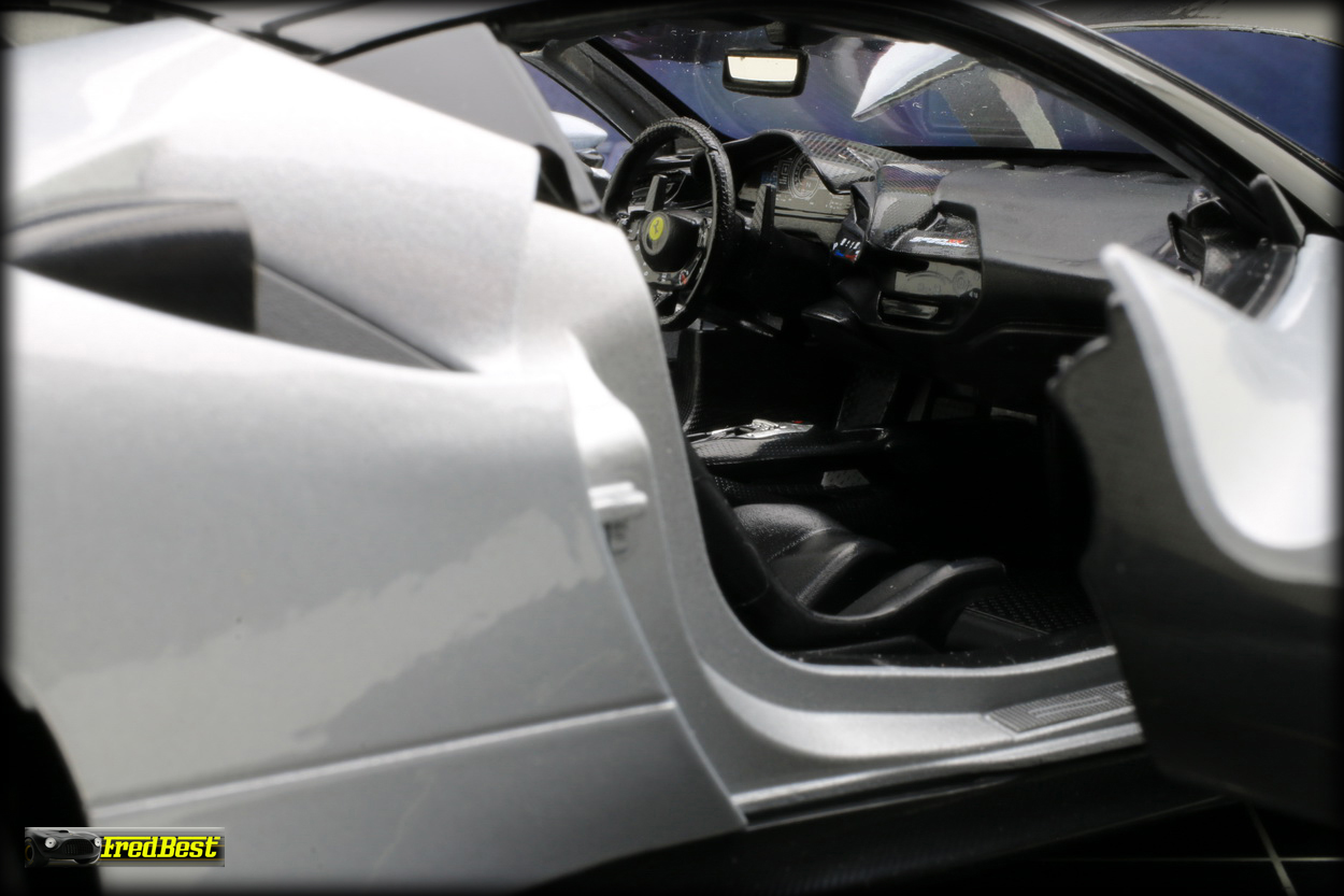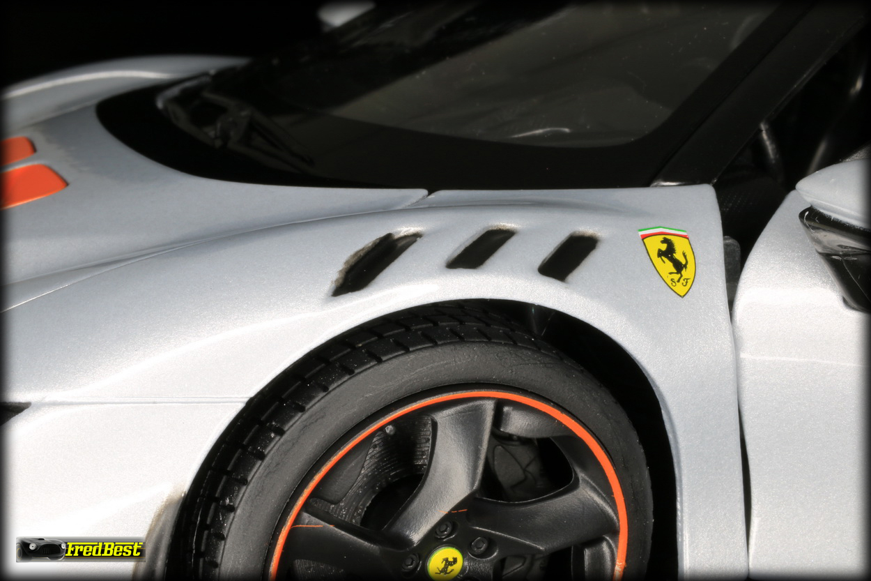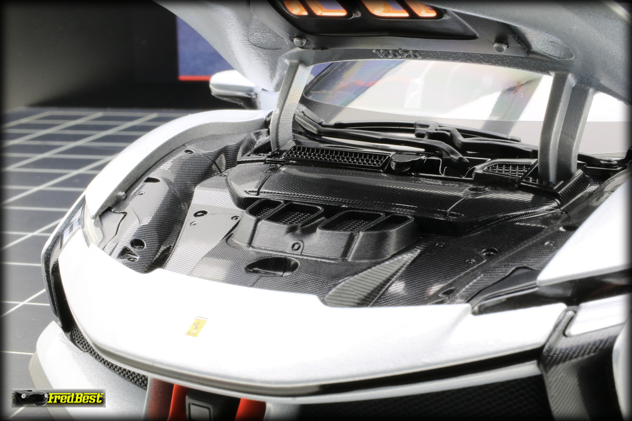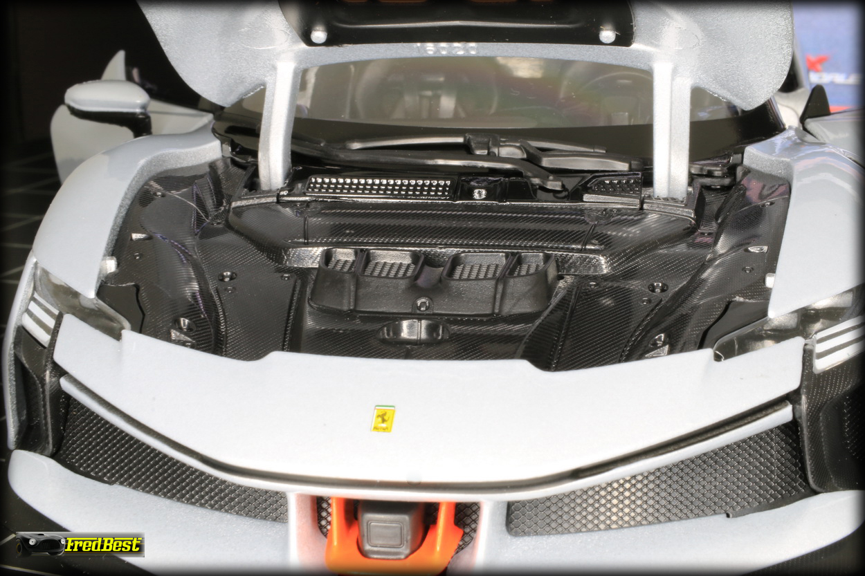 la SF90 XX sans être exceptionnel est toujours assez convaincant, les ajustement des ouvrants, porte, coffre avant et arrière, sont relativement bons et les jantes noires avec leur cerclage rouge sont du plus bel