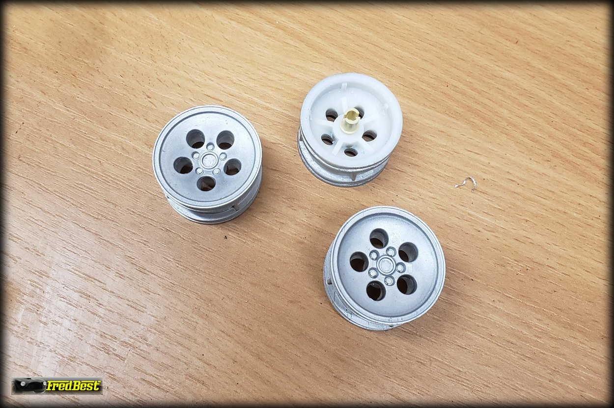 j'ai dû reduire l'axe des deux roues avant qui ressortaient d'au moins un centimètre du gabarit des ailes. Il a donc fallut faire chauffer l'imprimante 3D et un petit coup de peinture alu plus tard, le préjudice était