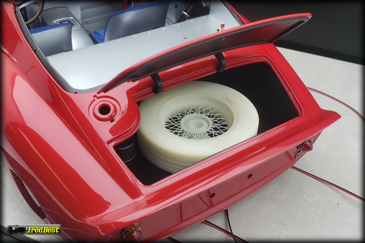 va falloir corriger ! Alors c'est parti: masquage en règle de la partie avant de la carrosserie et passage à la bombe d'aluminium. Enfin cette 250 GTO commence à ressembler à une 250 GTO avec le montage de ses phares.