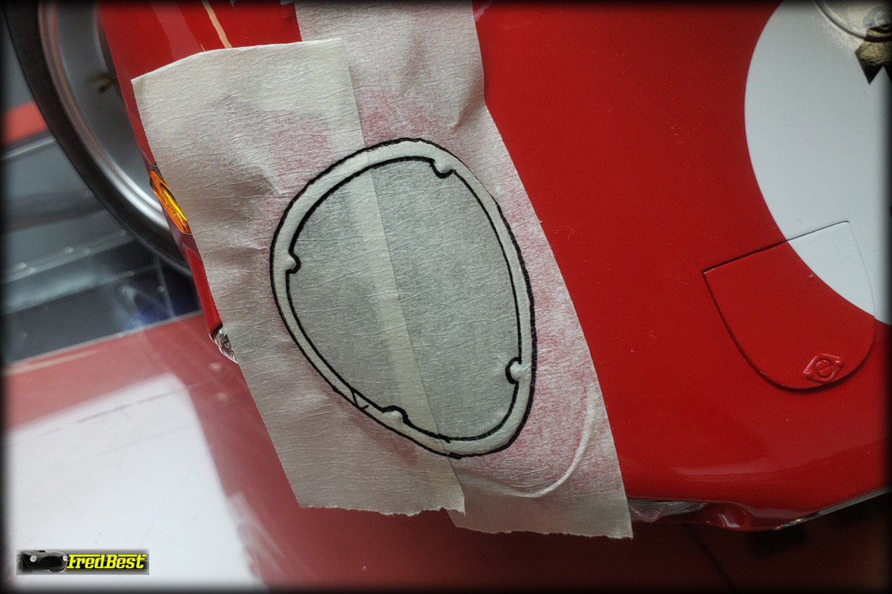 Aucune GTO d'époque ne possède de Scudetto sur ses ailes et encore moins 3987GT à Montlhery. Il faut donc les supprimer, pour cela j'utilise délicatement un coton imbibé de dissolvant sans acétone !