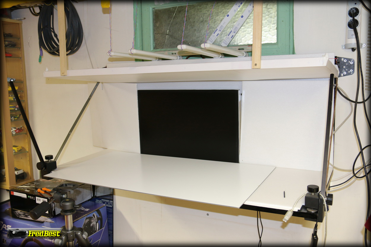 Plus simple que la tente photo, il s'agit en fait d'une banale étagère noir laqué de 50 x 150 cm fixée au mur. Cette installation me permet à loisir de