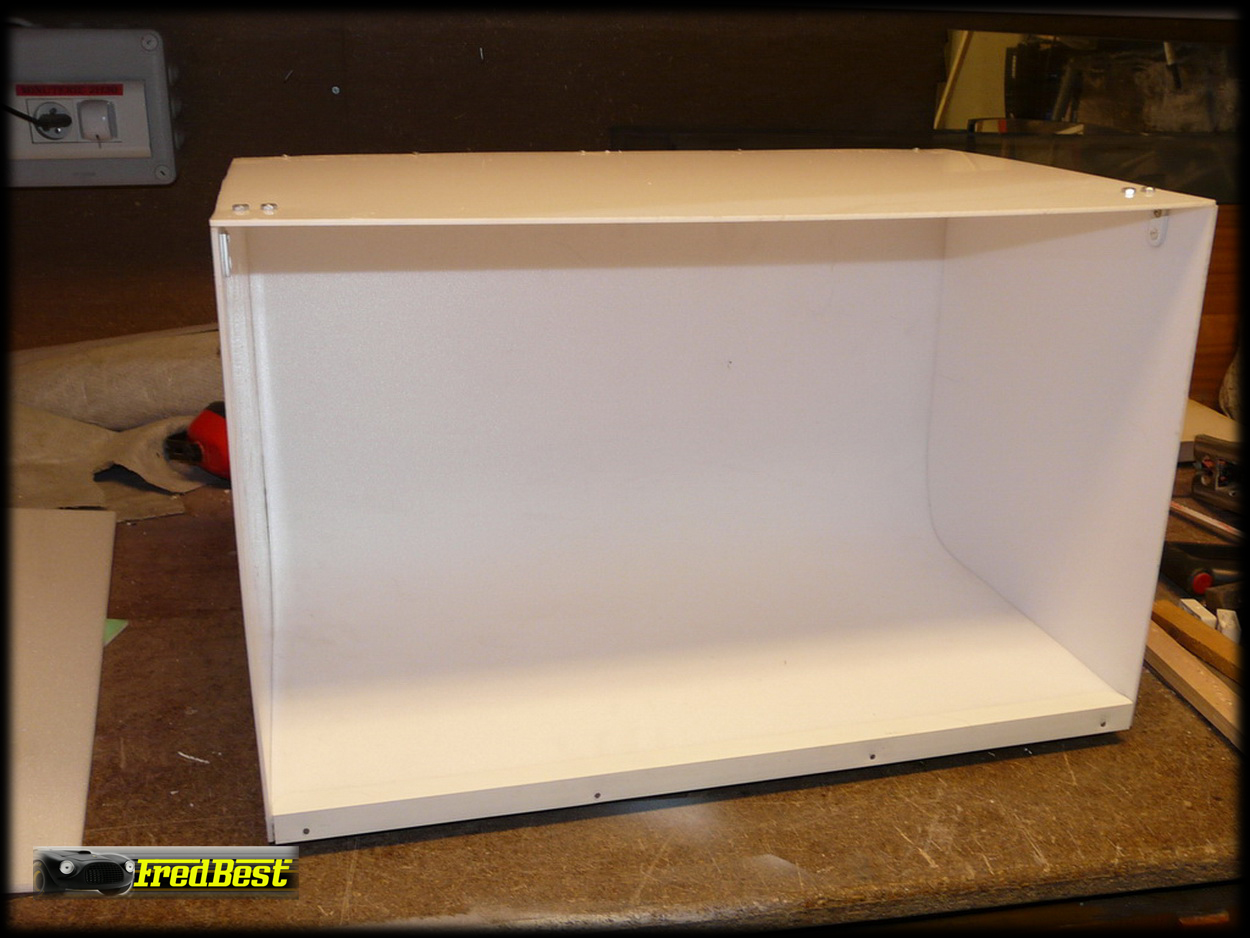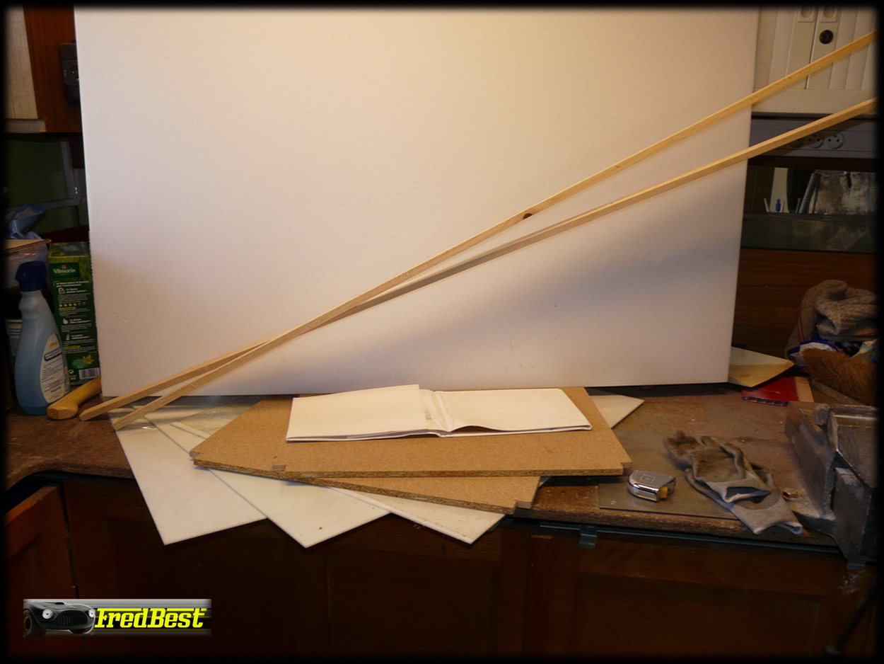 Je me suis donc muni de planches, baguettes, PVC blanc, d'une plaque de Dépron pour le fond et même de pieds récupérés sur un vieil ampli: