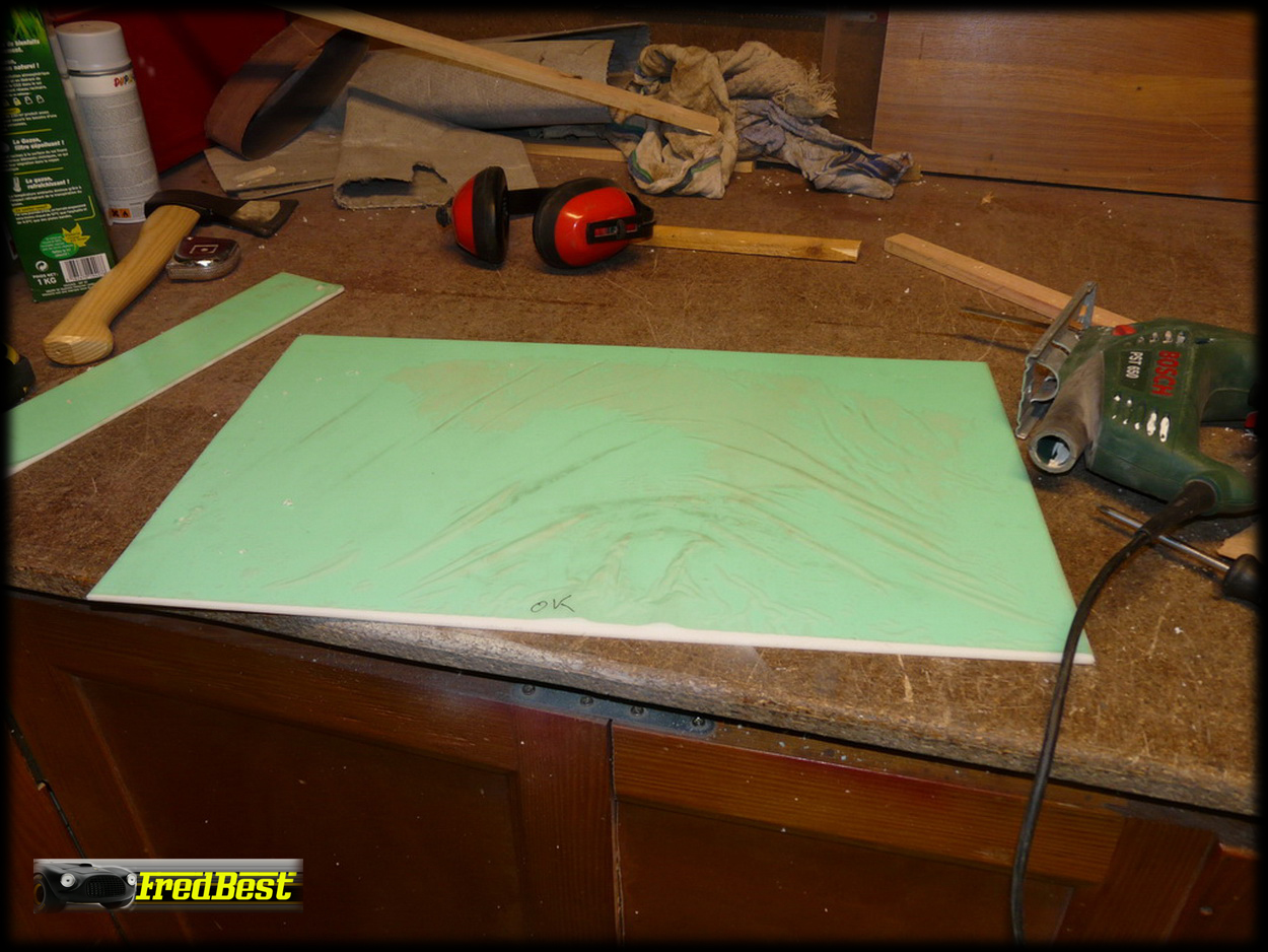 Mise en place de la plaque de Dépron et pose d'une cornière PVC pour la maintenir en place. Cette dernière me