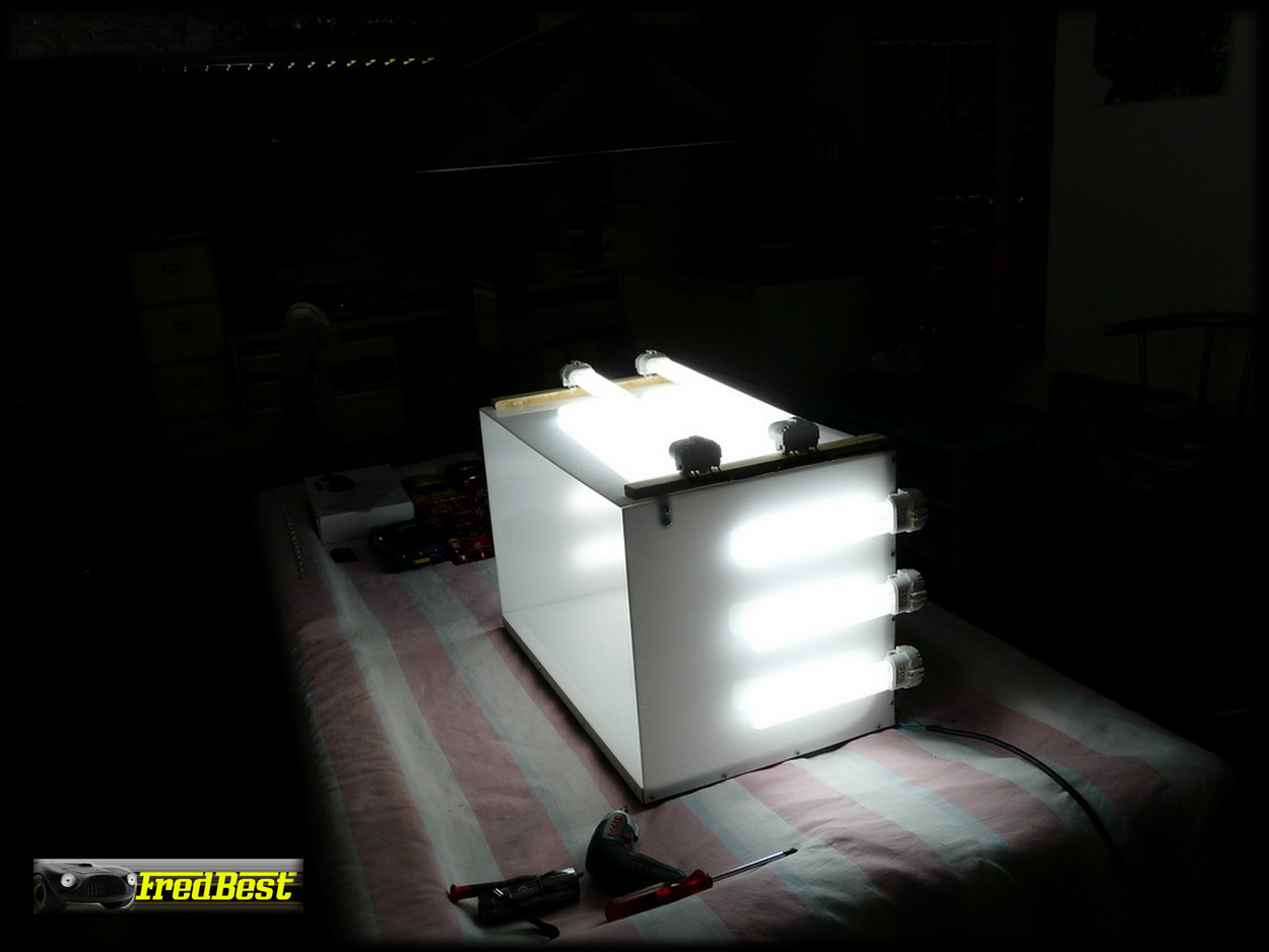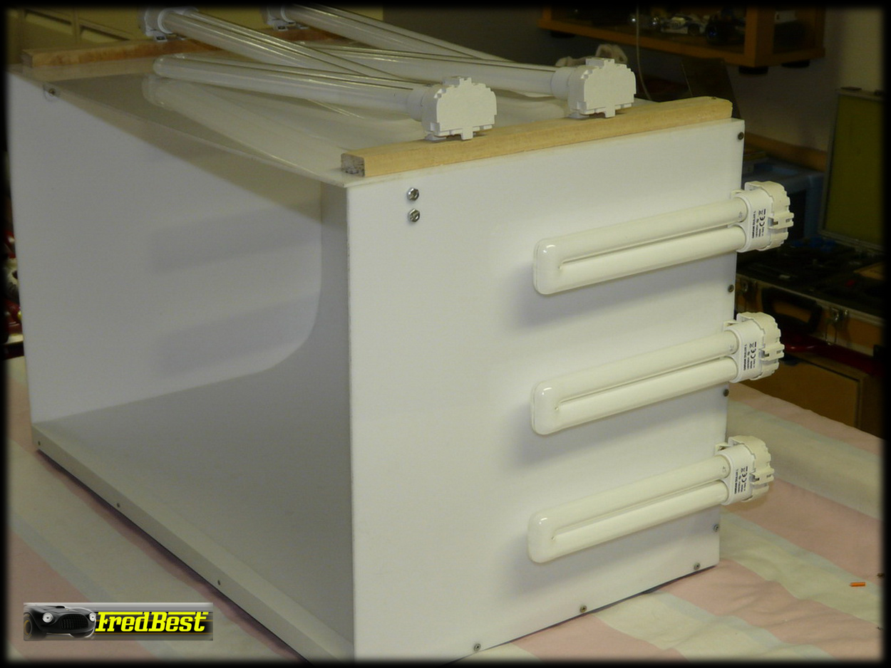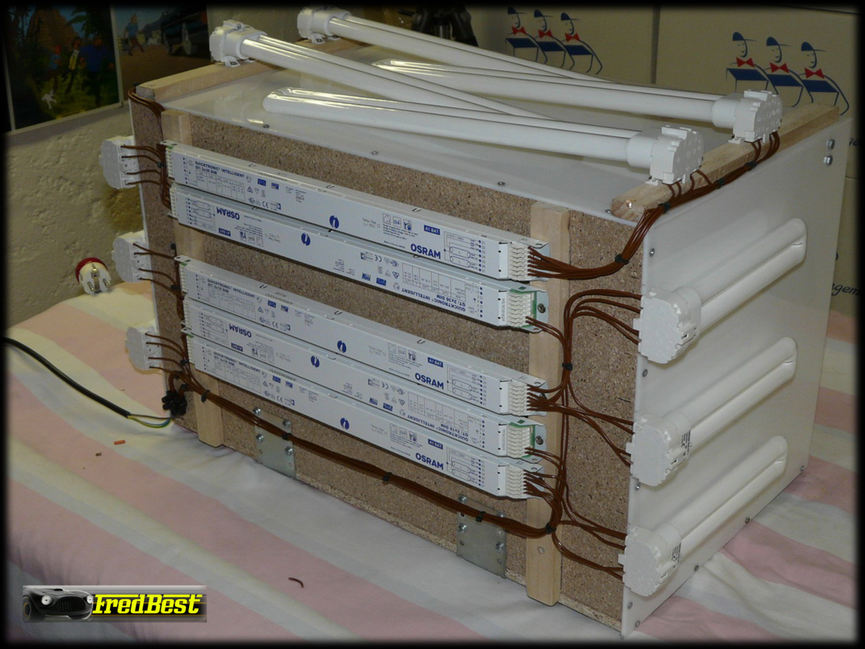 Je vais utiliser des néons, 4 x 36W, et pour les latéraux 3 x 11W de chaque côté. Une fois bien chaud ça devrait