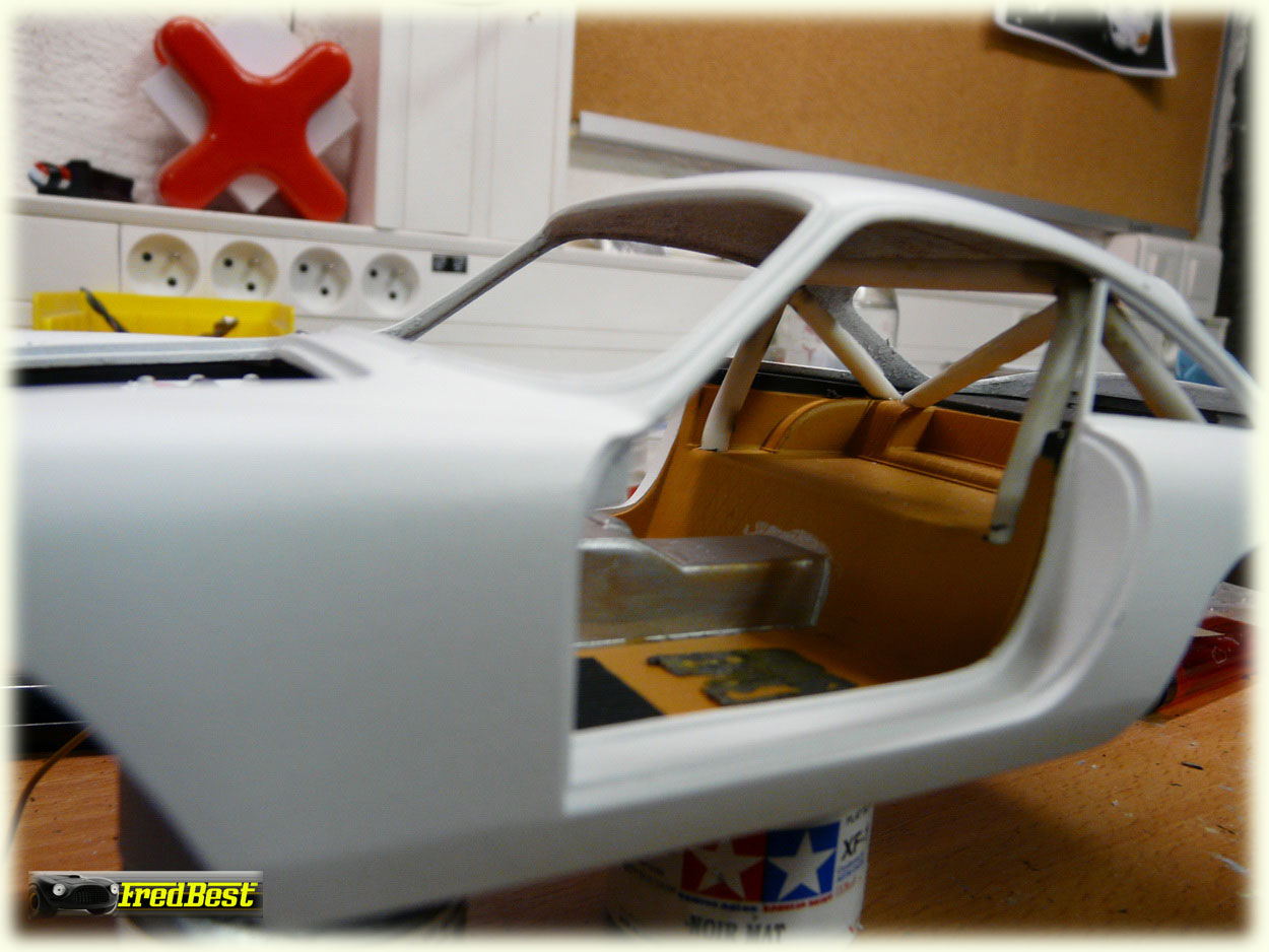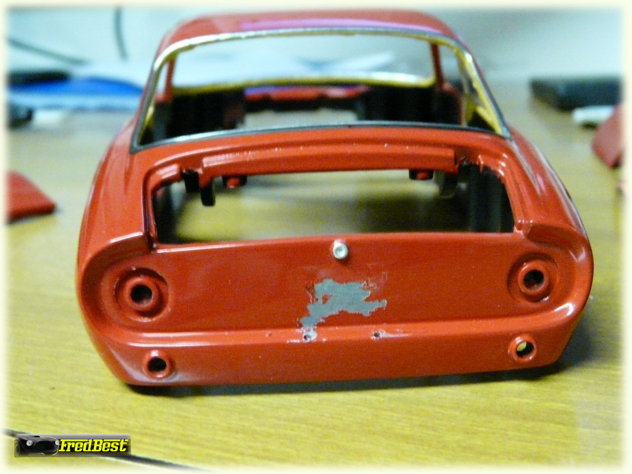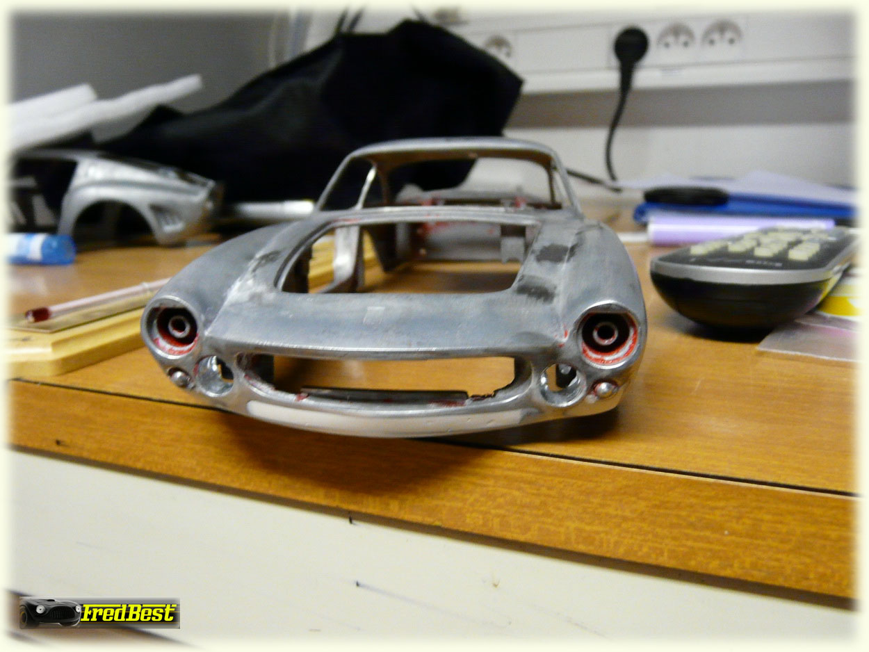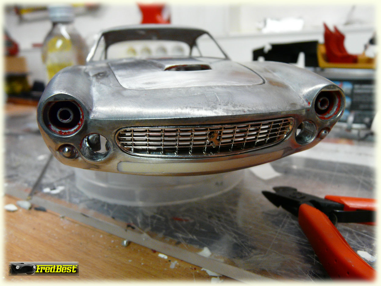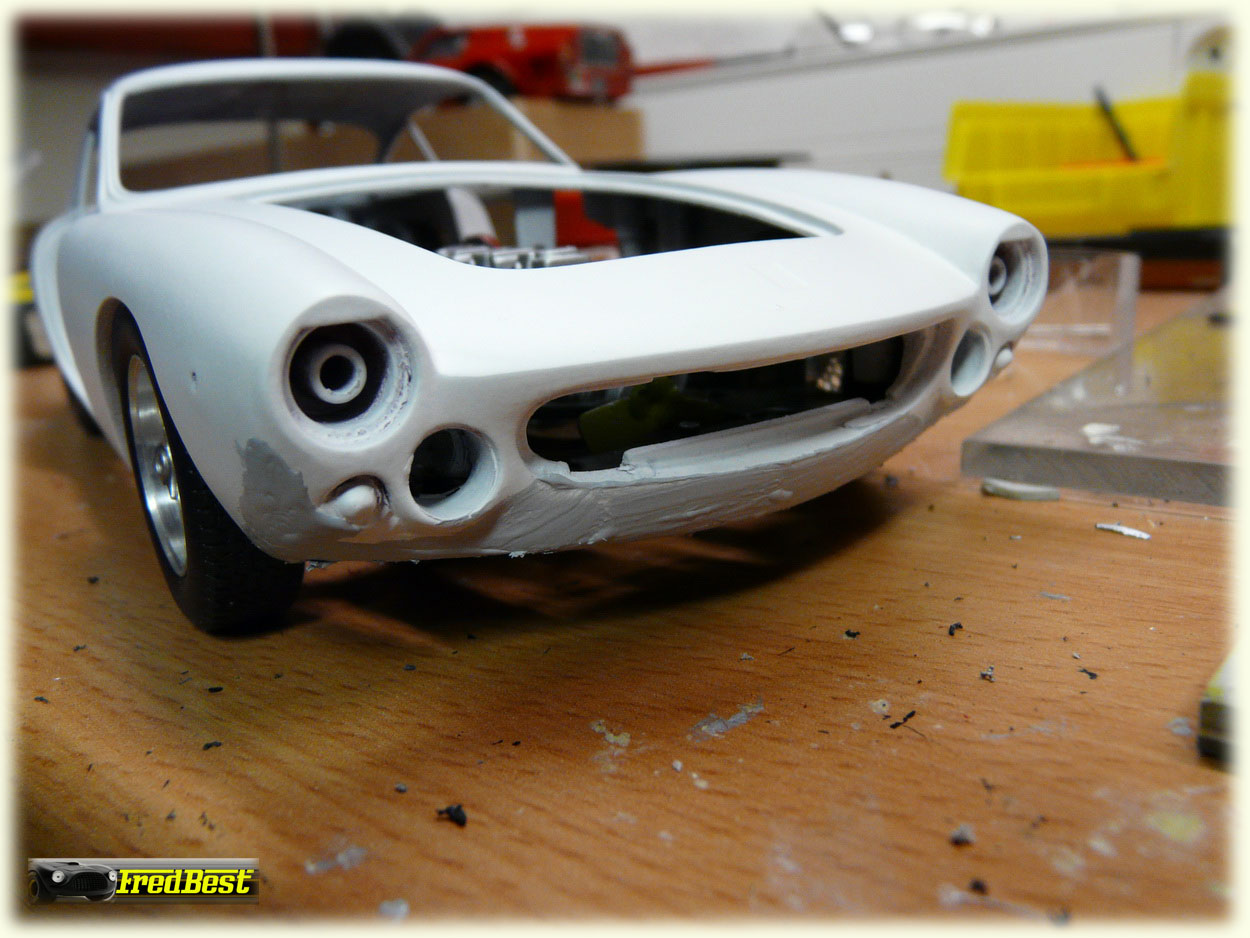 Suppression des pare-chocs avant et masticage de leurs anciens emplacements.