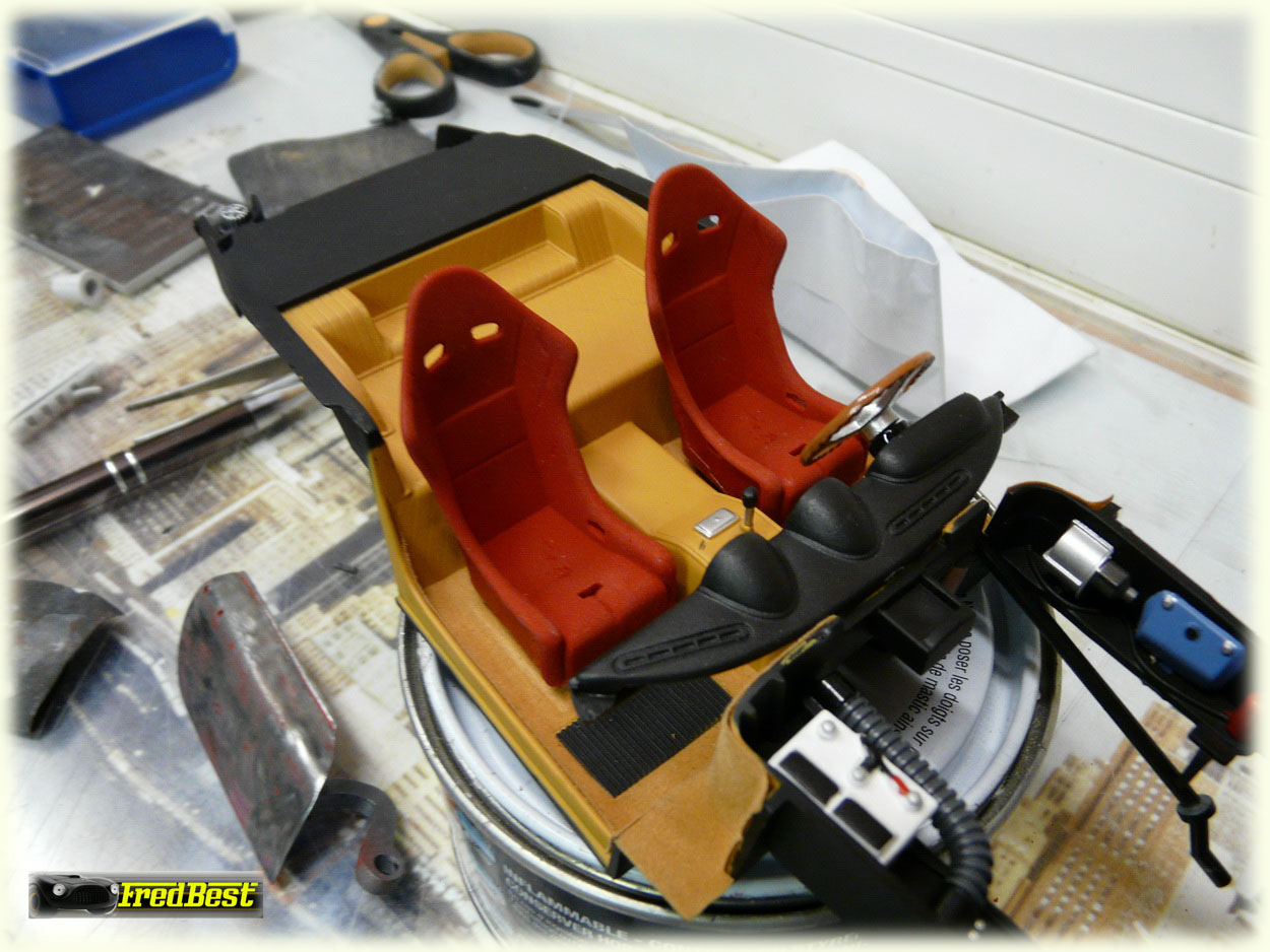 Mise en place des harnais de sécurité, peinture carrosserie avec la bande jaune, et pose des décalcomanies.