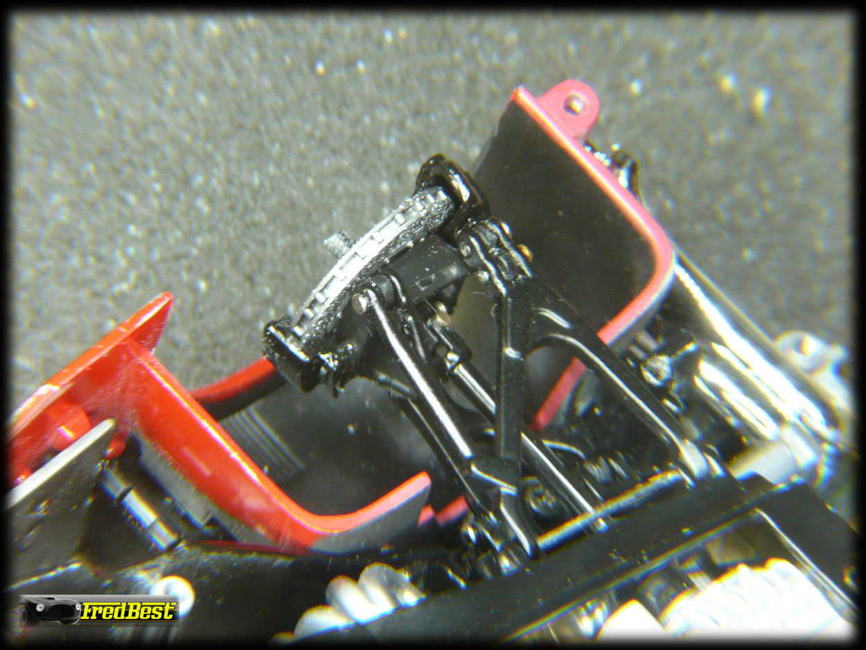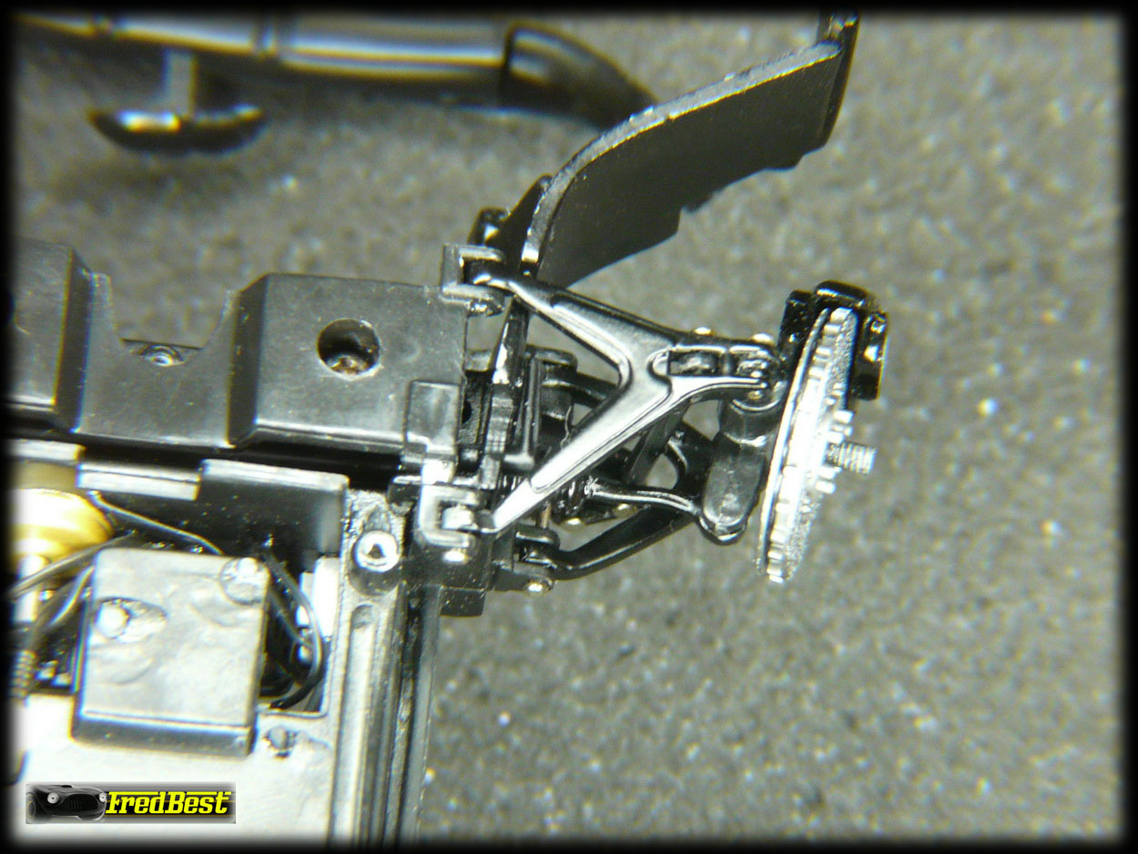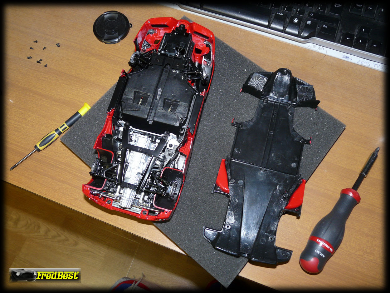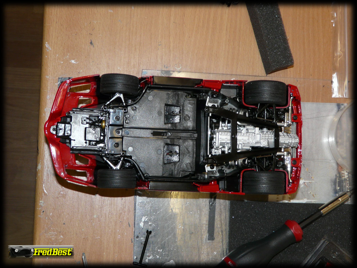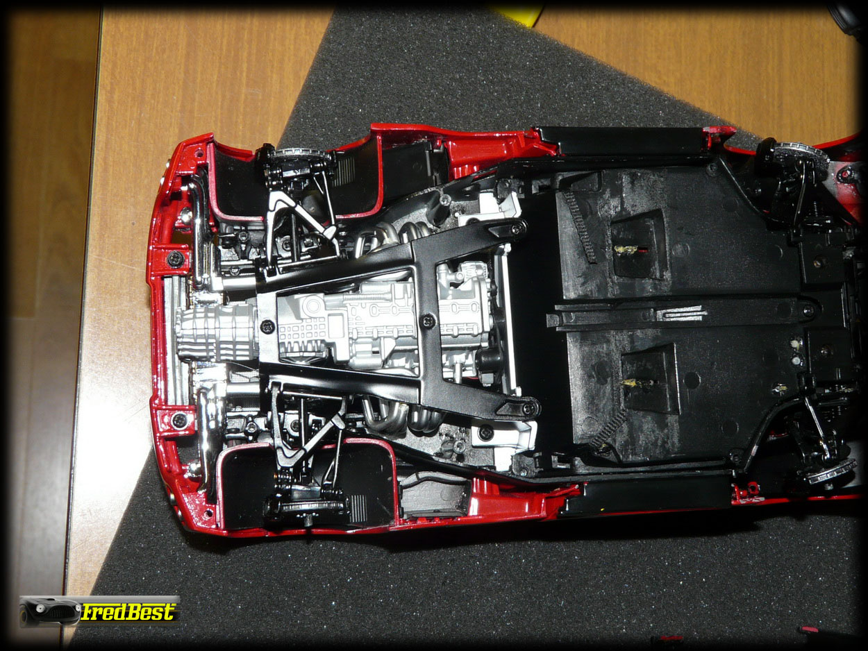Une fois remontée sur le châssis, l'arrière de cette Enzo retrouve de l'allure, et en l'absence de fond plat on peut admirer les soubassements