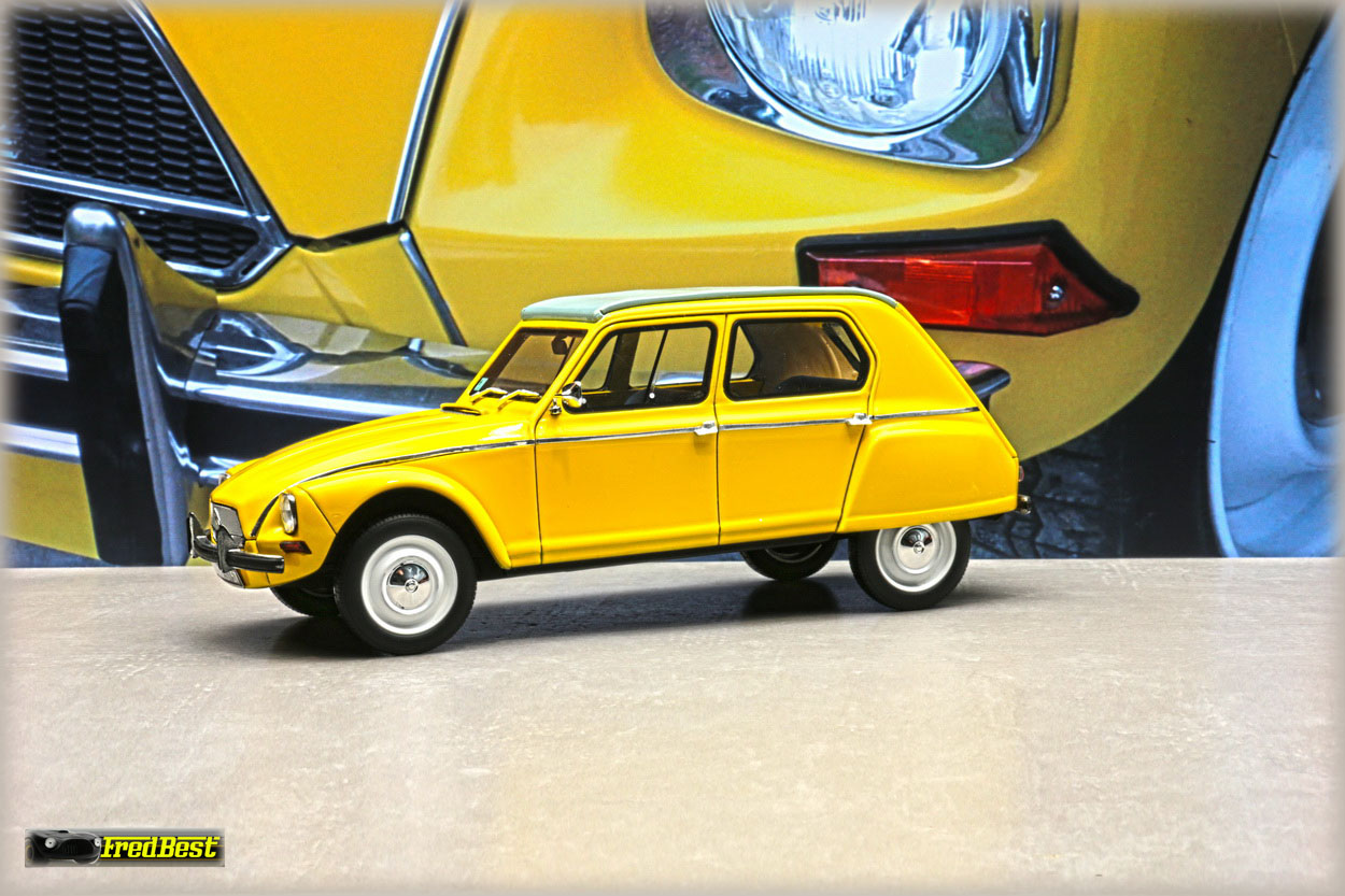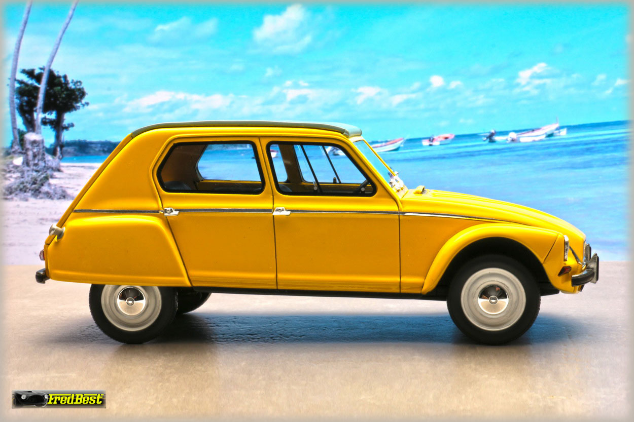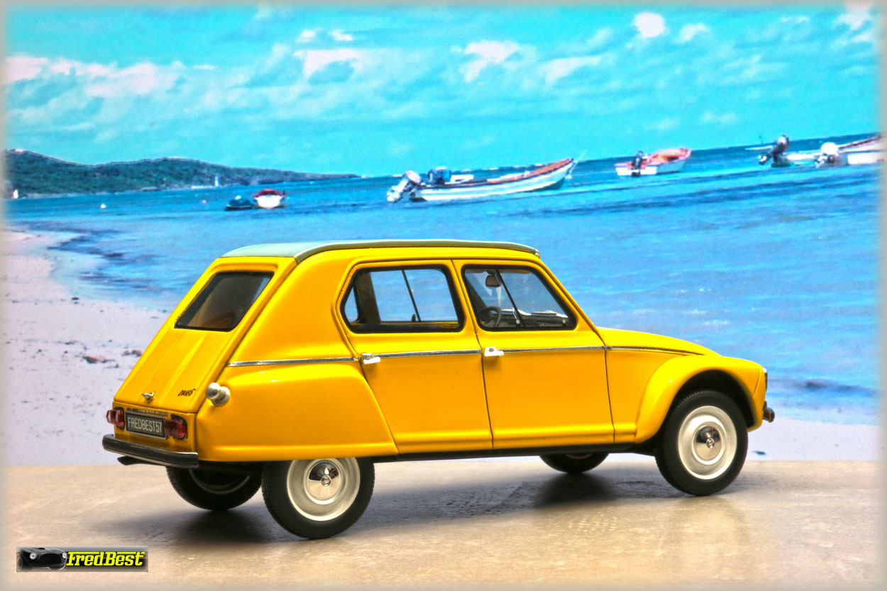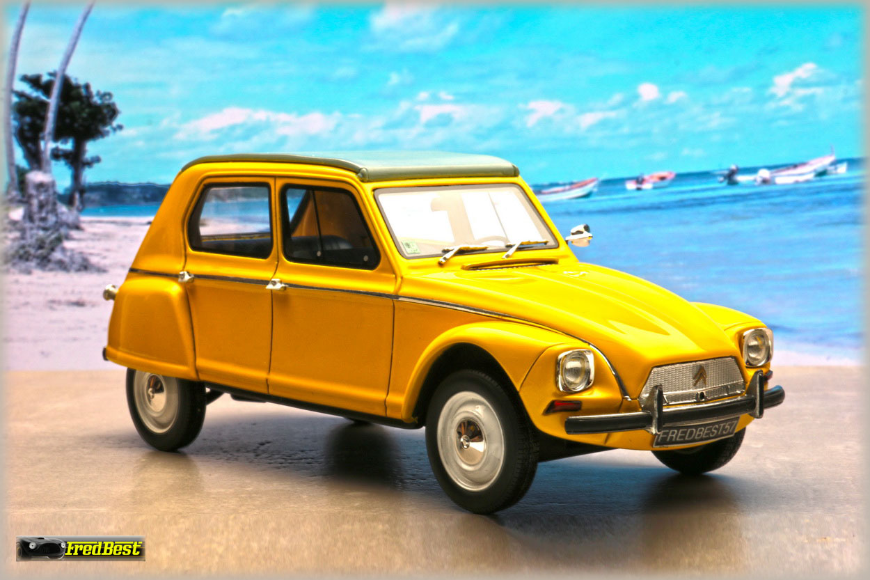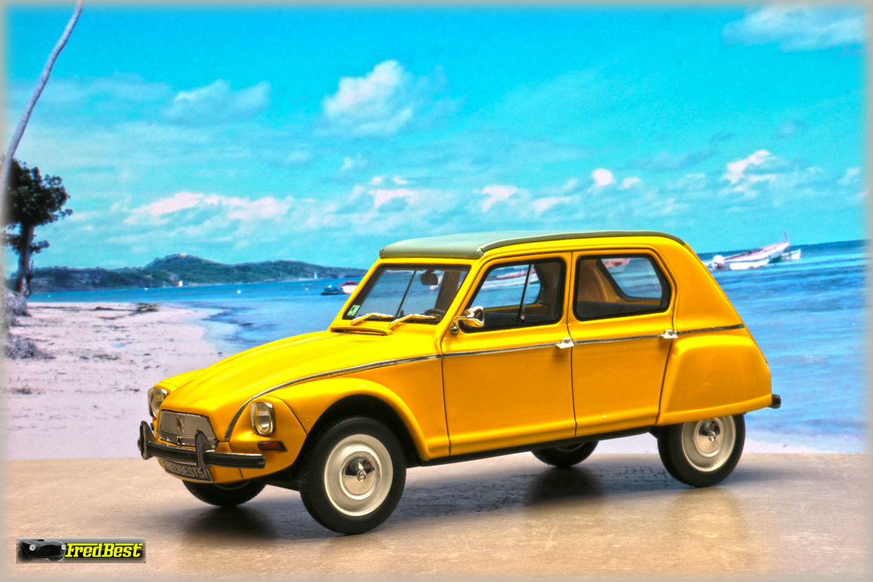 Acquise pour être repeinte en jaune, cette Dyane 6 réalisée par OttOmobile, deviendra la réplique de celle que je restaure au 1/1.