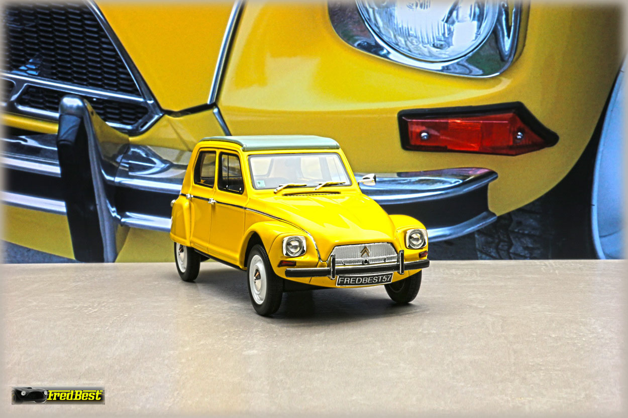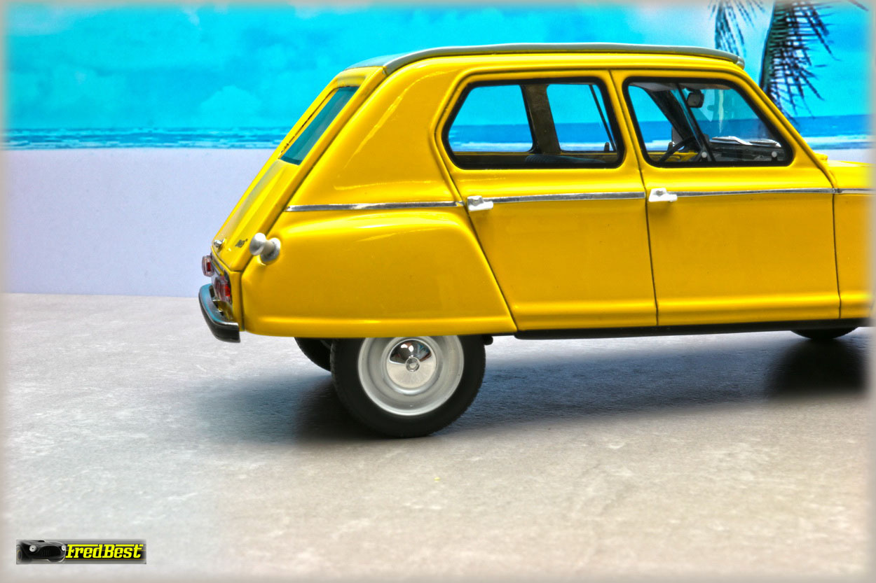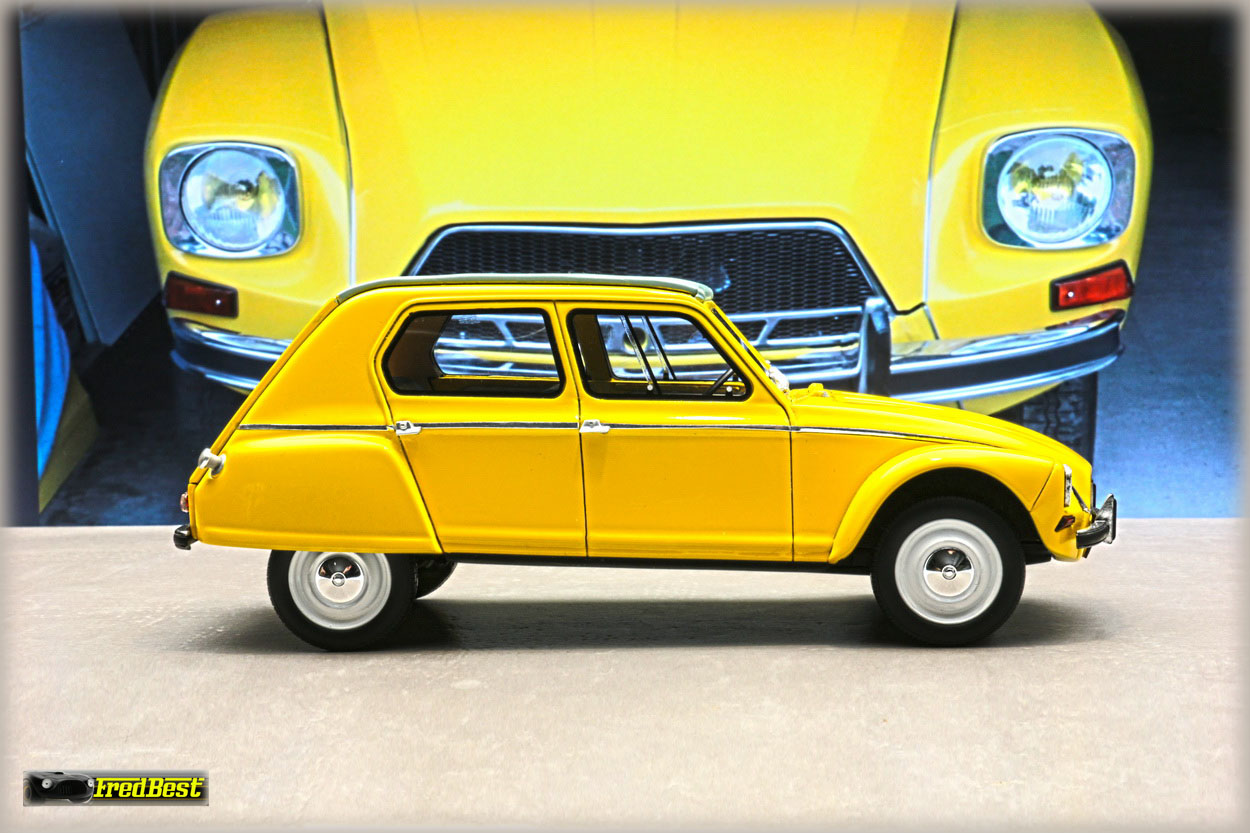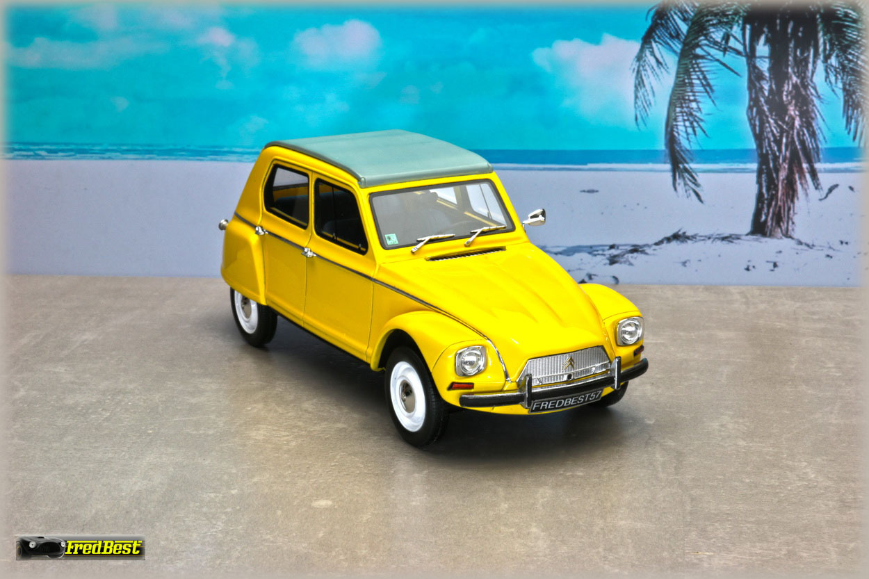 Acquise pour être repeinte en jaune, cette Dyane 6 réalisée par OttOmobile, deviendra la réplique de celle que je restaure au 1/1.