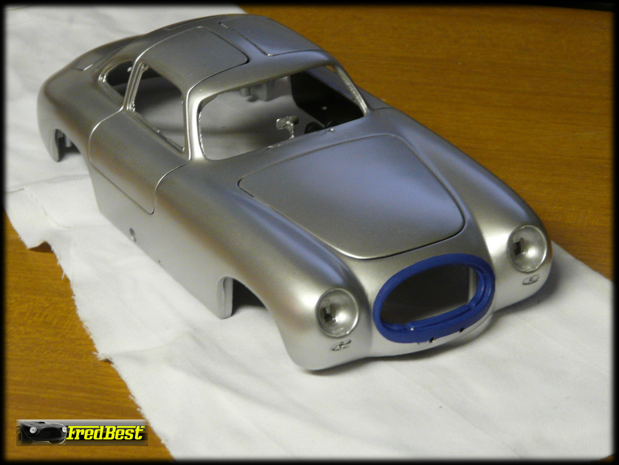 Une fois la carrosserie ayant retrouvé une couleur grise homogène, l'entourage de la calandre est passé en bleu et la pose des décalcomanies peut commencer avec la recréation d'un logo "300 SL" pour le capot arrière .